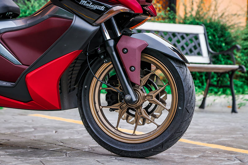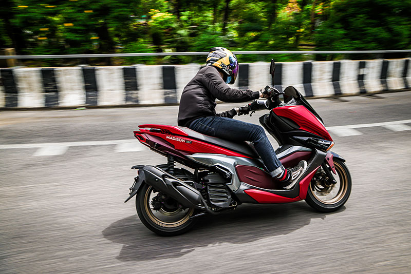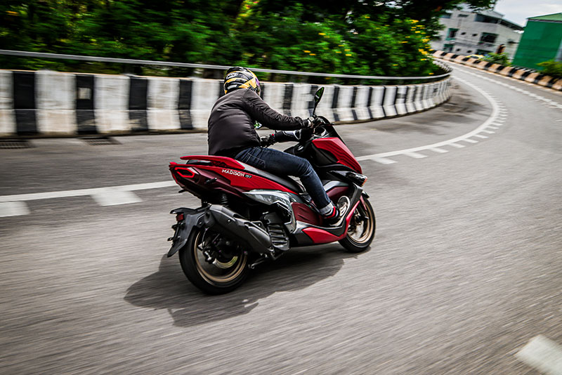 อีกจุดที่ต้องพูดคือ ชุดยางติดรถ IRC IZ-S ขอบ 14″ คือยางที่มีสมรรถนะค่อนข้างสูงสําหรับรถจักรยานยนต์สกู๊ตเตอร์ที่มีจำหน่ายในบ้านเรา ดังนั้นเมื่อโช้คอัพที่เซ็ตอัพมาดีทำงานร่วมกับยางเยี่ยมๆสักชุด ทำให้การขับขี่ใช้งานของ Madison 150 เลย “สบาย” เพิ่มความมั่นใจให้ผู้ขับขี่ กล้าทำความเร็ว กล้าเข้าโค้ง กล้าเรียกใช้งานสมรรถนะรถอย่างเต็มที่มากขึ้นด้วย