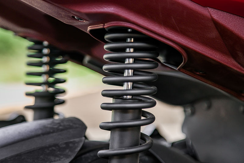 แทนที่จะใส่อะไหล่ที่ชื่อฟังดูหวือหวา… Madison 150 เลือกใส่ออปชั่นที่ “เซ็ตมาดี” กับการใช้งานรูปแบบ City-use… โช้คอัพหน้าแบบเทเลสโคปิค และโช้คอัพหลังสปริงคู่ที่สามารถปรับระดับได้ถึง 5 ระดับการใช้งานทั่วไปทำได้ยอดเยี่ยมแม้ระยะยุบจนไม่ได้ให้มาเยอะ แต่ค่าความหนืดนั้นตอบสนองกับการซับแรงกระแทกในลักษณะต่อเนื่องได้นุ่มนวลดี