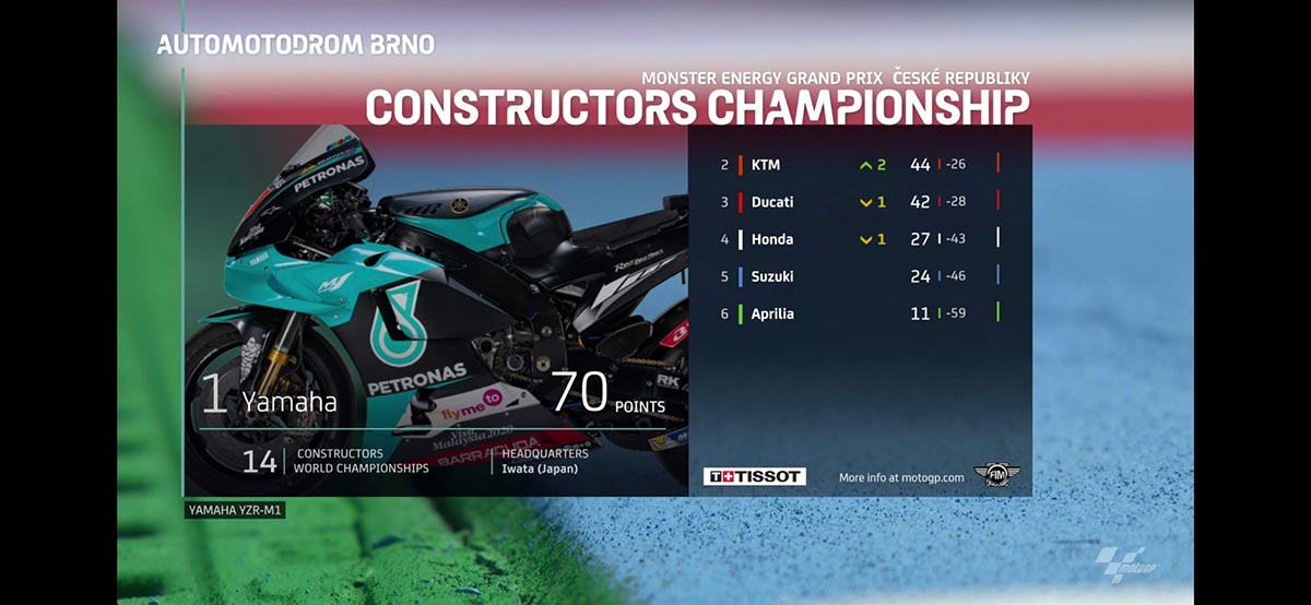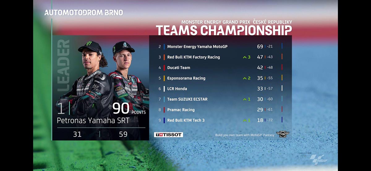 รวมถึง ยามาฮ่า ที่ยังนำโด่งบนตารางแชมเปี้ยนชิพประเภทค่ายผู้ผลิต โกยไปแล้วทั้งสิ้น 70 คะแนน ทิ้งห่าง เคทีเอ็ม ที่อยู่ในอันดับ 2 ถึง 26 คะแนน ขณะที่ ปิโตรนาส ยามาฮ่า เอสอาร์ที ยังคงเป็นผู้นำบนตารางแชมเปี้ยนชิพประเภททีม มีทั้งสิ้น 90 คะแนน ตามด้วย มอนสเตอร์ เอเนอร์จี้ ยามาฮ่า โมโตจีพี ในอันดับ 2 มี 69 คะแนน