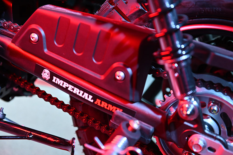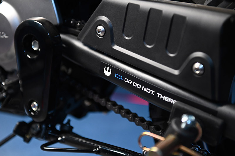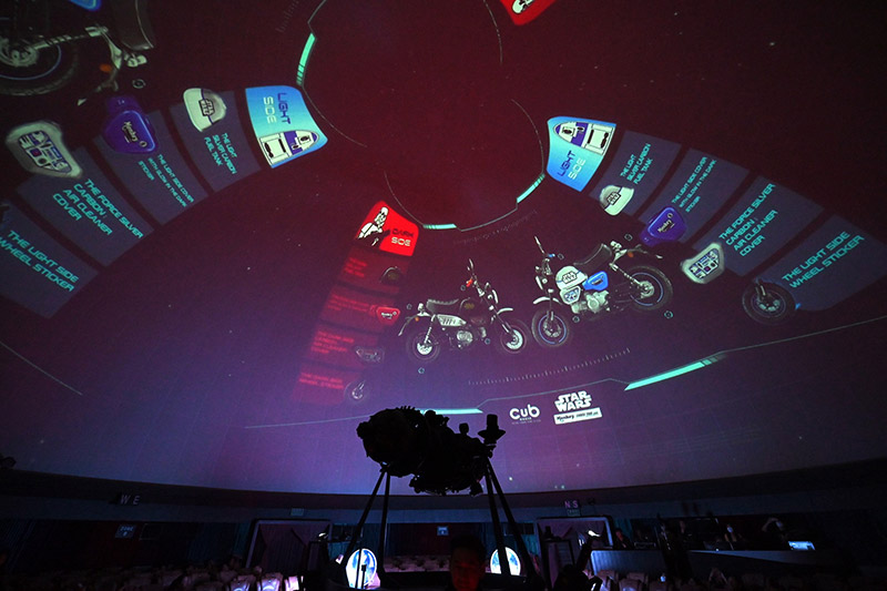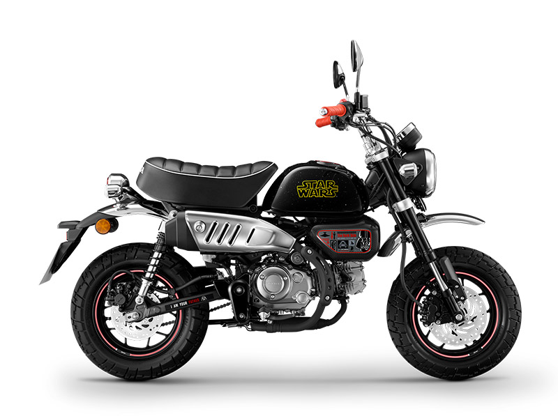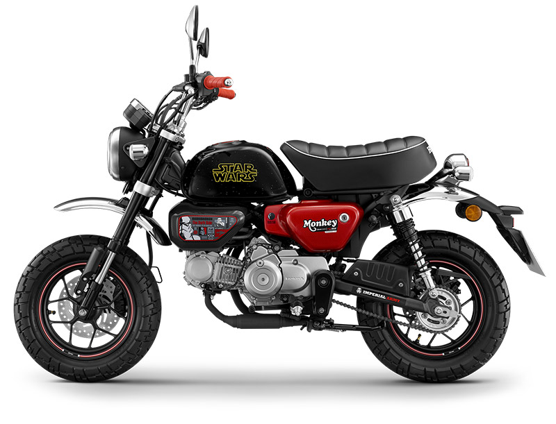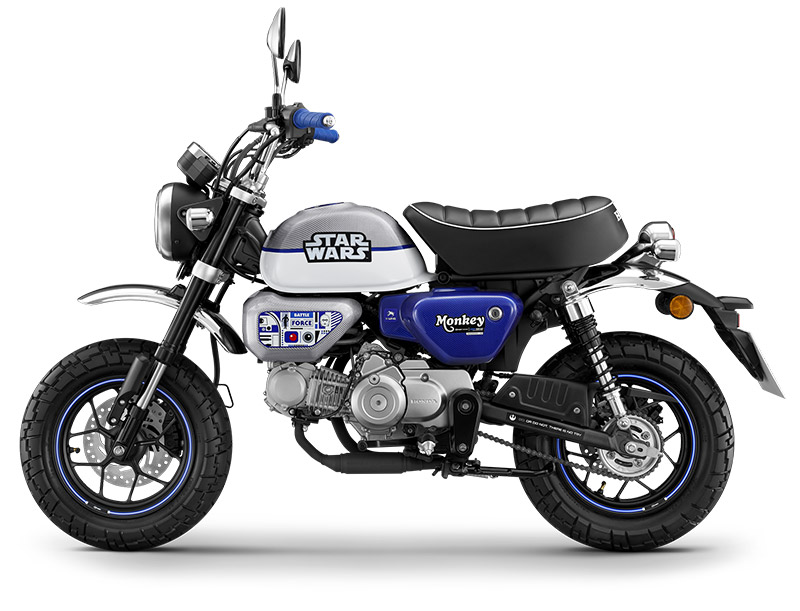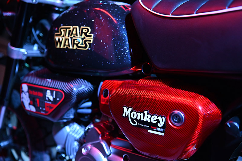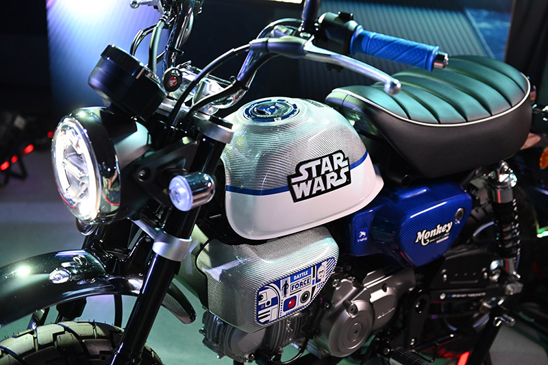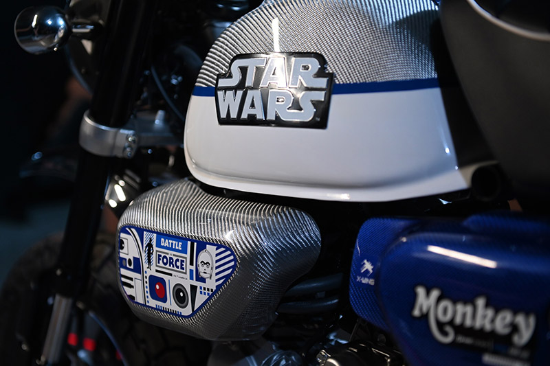เริ่มด้วย Honda Monkey Star Wars Limited Edition : Light Side โดดเด่นด้วยดีไซน์กราฟิกบนตัวถังน้ำมันโทนสีขาว-น้ำเงิน หุ้มด้วยคาร์บอนไฟเบอร์สีเทาในธีมยานอวกาศ พร้อม Emblem โลโก้ Star Wars แสดงถึงเอกลักษณ์ของพลังที่โดดเด่น มาพร้อมฝาครอบข้างหุ้มคาร์บอนไฟเบอร์สีน้ำเงิน ให้ความสวยงามมีมิติ พร้อมสติกเกอร์ Monkey ที่สามารถเรืองแสงได้ในยามค่ำคืน และสติกเกอร์ยาน X-Wing ของฝั่ง Light Side เข้าคู่กับครอบกรองอากาศสีเทาที่มีตัวละคร R2-D2 เพิ่มเข้ามาทำให้โดดเด่นคู่กับสีสันที่ลงตัว