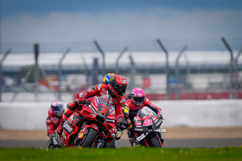 เริ่มดราม่าที่รอบคัดเลือกสุดอลเวง กับพายุฝนซัดกระหน่ำสนามแข่ง Silverstone Circuit จนนักแข่งหลายๆคนเป๋ทำเวลาไม่ได้ แต่ก็ยังเป็นบรรดานักแข่งค่ายยุโรปที่ยึดกริดสตาร์ทกลุ่มหน้าเสียส่วนใหญ่.. เริ่มต้นโดย #72 Marco Bezzecchi (Mooney VR46 Racing Team) ในกริดที่ 1 โดน #43 Jack Miller (Red Bull KTM Factory Racing) ออกตัวชิงโฮลช็อตไปก่อน ตามด้วย Bagnaia ผู้เกรี้ยวกราด บิดคันเร่งทีเดียว แซงควบ 2 คน ขึ้นนำ P1 ได้ทันทีในอีกไม่กี่รอบถัดมา ขยับอดีตเพื่อนร่วมทีมในชุดสีส้มหล่นไปด้านหลัง ในขณะที่คลื่นลูกยักษ์กำลังค่อยๆย่างเข้ามาจากกริดสตาร์ทที่ 12 ..รถที่เร็วที่สุดในสนามกำลังจะกลืนกินกลุ่มจ่าฝูง..