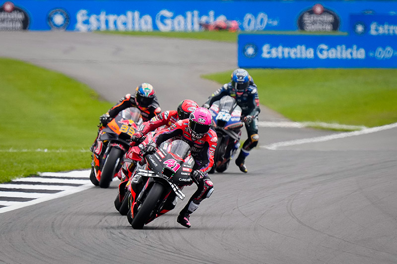 ช่วงท้ายเกมเป็นความเลิ่กลั่กของทีมงานในพิท เมื่อฟ้าฝนบริเวณเกาะอังกฤษเริ่มทำหน้าที่ จนเจ้าหน้าที่สนามต้องออกมาโบกธงขาวให้เปลี่ยนรถได้ แต่ด้วยความที่เกมกลุ่มหน้าเดือดจัดๆ จึงไม่มีใครเข้าพิทเปลี่ยนยางฝน หากแต่ยังขี่หวดกันต่อไปเสียอย่างนั้น โดยนักแข่งที่โดนฝนแล้วของขึ้นอย่าง #33 Brad Binder (Red Bull KTM Factory Racing) และ #88 Miguel Oliveira (CryptoDATA RNF MotoGP™ Team ) มีโอกาสเปิดศึกกันอย่างดุเดือดจนไปถึงท้ายรถของ Aleix ในตำแหน่ง P2 ซึ่งนักบิดผู้นำของ Aprilia ก็ยังไม่ยอมแพ้ หวดชิงตำแหน่งคืนไปไล่ Pecco ต่อได้สำเร็จ ก่อนจะฉวยจังหวะช่วงไม่กี่โค้งก่อนจบเรซ ขยับแซง Pecco พร้อมขับขี่ปิดไลน์ ปิดโอกาสที่รถหมายเลข 1 จะขึ้นนำได้ทัน คว้าชัยไปแบบคนเก๋าๆเขาทำกัน