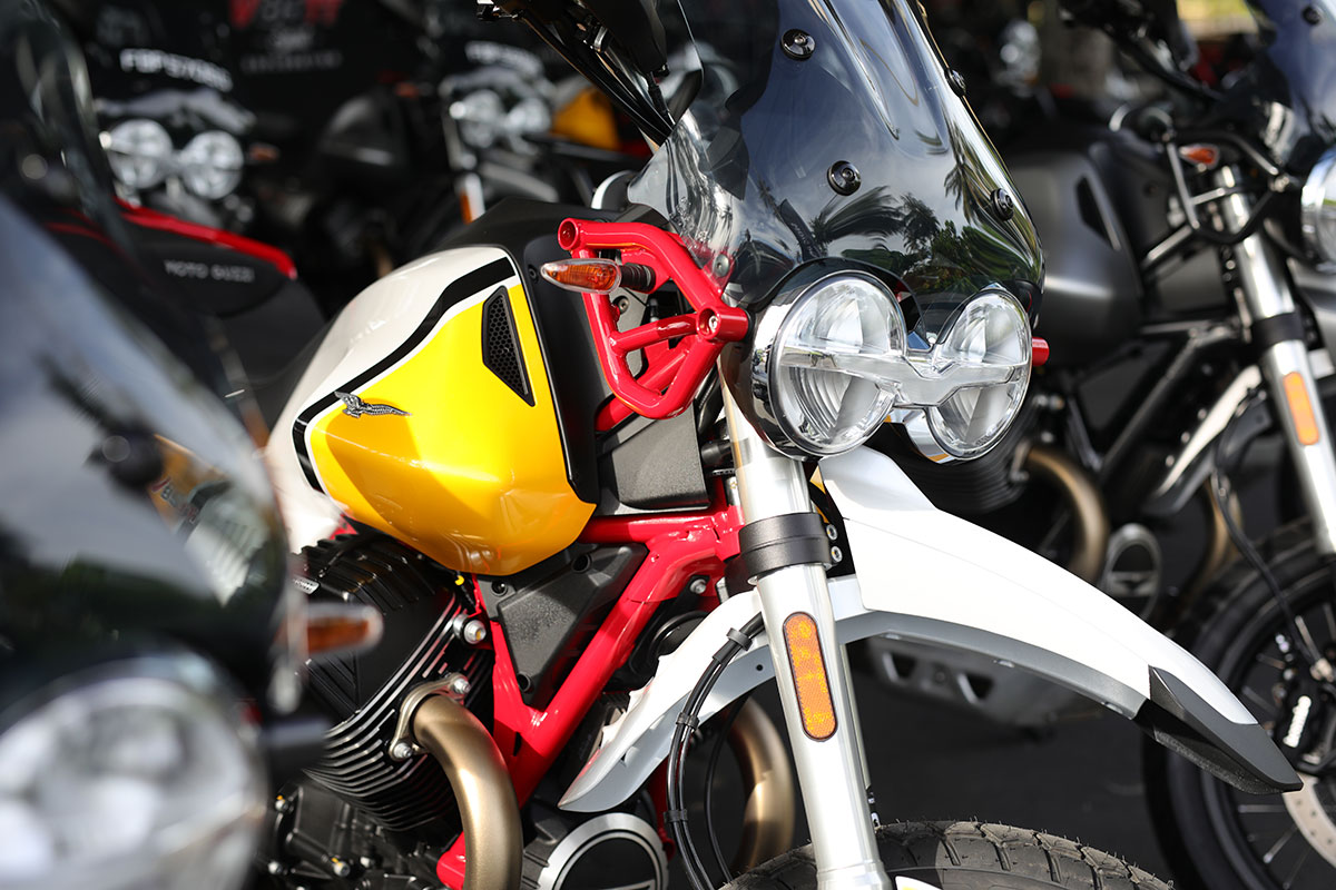 คันที่ผมได้ขี่เป็น Giallo Sahara กราฟิกสีเหลืองตัดกับสีขาว ตัวเฟรมสีแดง ได้รับแรงบันดาลใจจากรถแข่งรายการ Paris Dakar ในอดีตอย่าง moto guzzi v65tt ปี 1985 ไฟหน้าดวงกลมสองดวงติดกัน ตรงกลางเป็นไฟ Daytime Running Light ที่เป็นเอกลักษณ์รูปนกอินทรีพร้อมกับชิลด์หน้าที่มีความสูงกำลังดี คลาสสิค ลงตัว