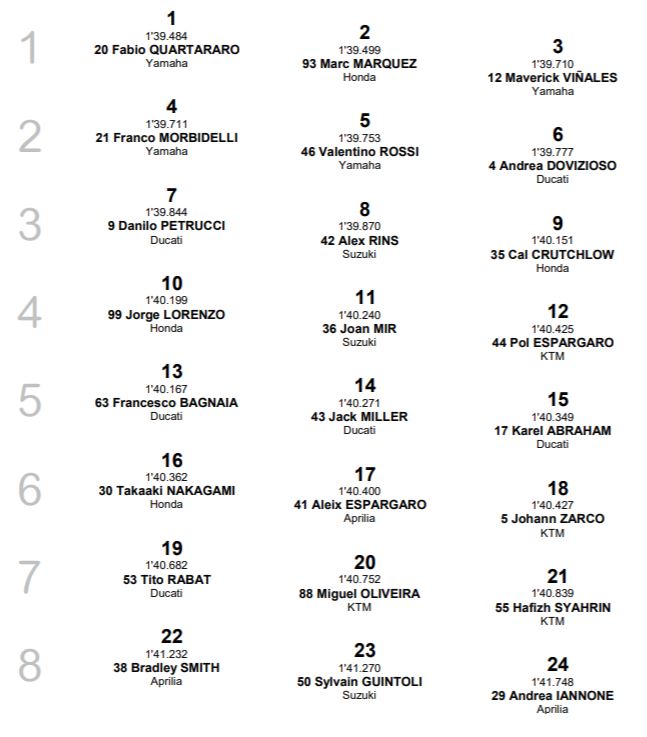 แต่คนที่ฟอร์มดีสุดๆยังคงเป็น #42 Alex Rins (Suzuki Ecstar Team) แม้จะพลาดล้มไประหว่าง Q2 ได้กริดสตาร์ทที่ 8 (แถวที่ 3) มาครอง.. คงต้องลุ้นกันหนักๆแล้วล่ะครับว่าสถานการณ์การแข่งขันในวันอาทิตย์ที่ 16 มิถุนายนนี้ จะเป็นอย่างไร ส่วนลำดับกริดสตาร์ททั้งหมดเป็นไปตามภาพด้านล่างนี้เลยครับ