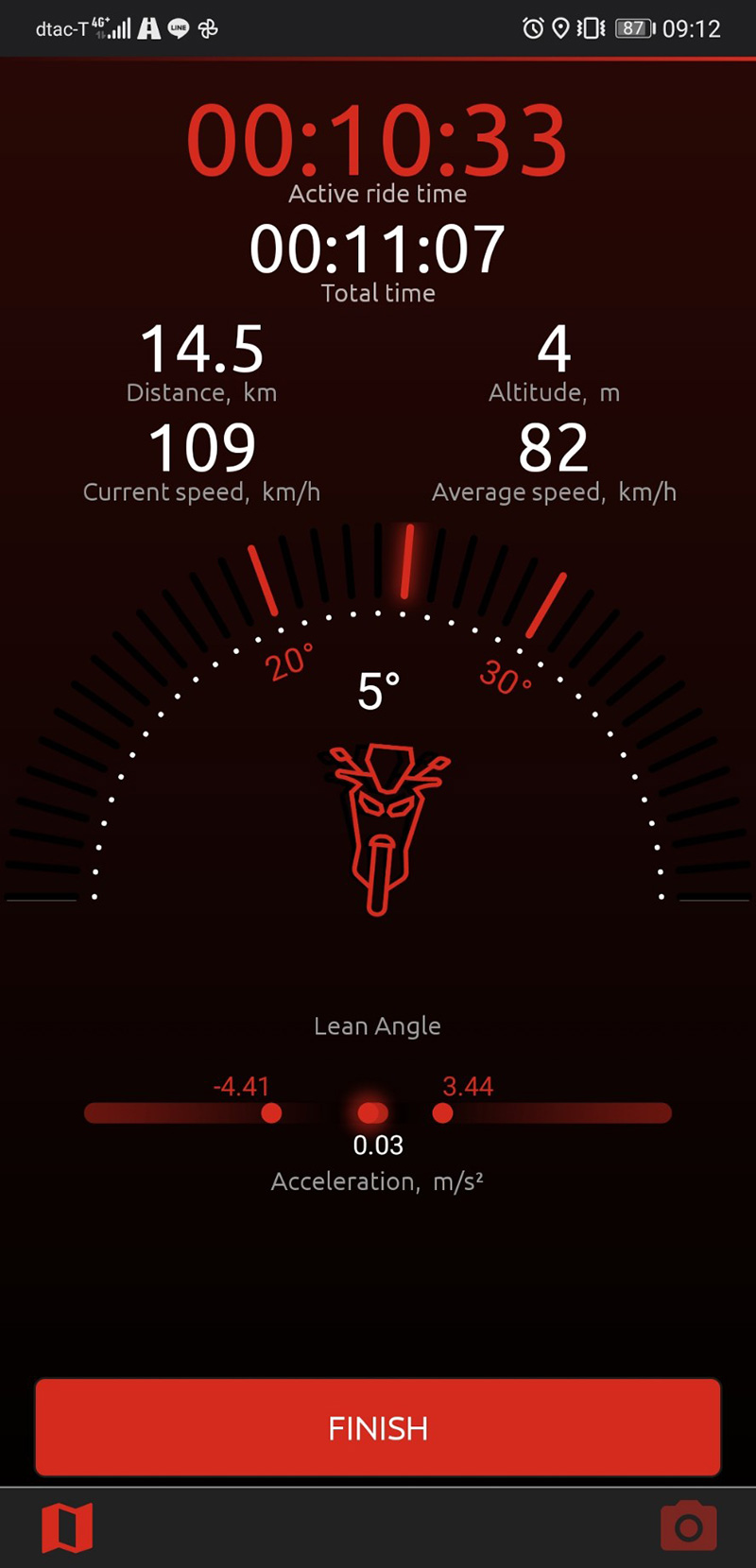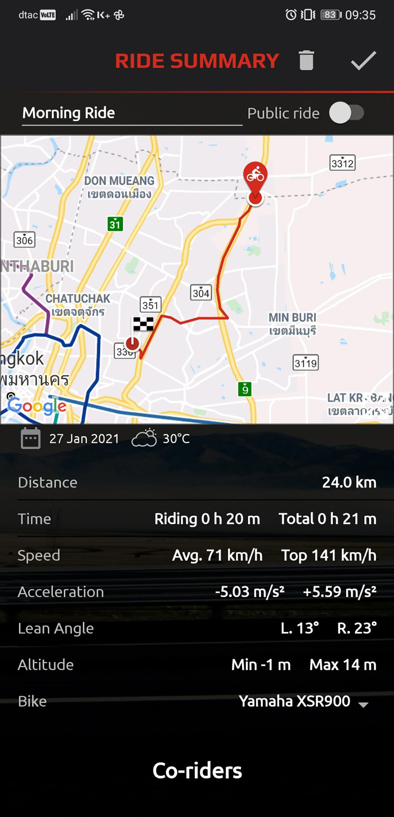 ทันทีที่เราจิ้มไปที่ปุ่ม Finish Riding ก็จะมีหน้าต่างขึ้นมาให้เราเห็นเป็นข้อมูลของการขับขี่ในครั้งนั้นทั้งหมด ซึ่งยังมีข้อมูลเชิงลึกอื่นๆที่ไม่ได้แสดงผลในหน้าจอเรียลไทม์ขณะที่เราขับขี่.. และนอกจากการสรุปในส่วนของข้อมูลที่แสดงผลในขณะขับขี่ก่อนหน้านี้แล้ว ยังรวมไปถึง ระยะทางรวม ตัวเลขท็อปสปีด องศาการเอียงมากที่สุดทั้งด้านซ้าย-ขวา ระดับความสูงจากน้ำทะเล สูงที่สุด-ต่ำที่สุด ตลอดการขับขี่ สภาพอากาศ และแผนที่เส้นทางที่ผ่านมา