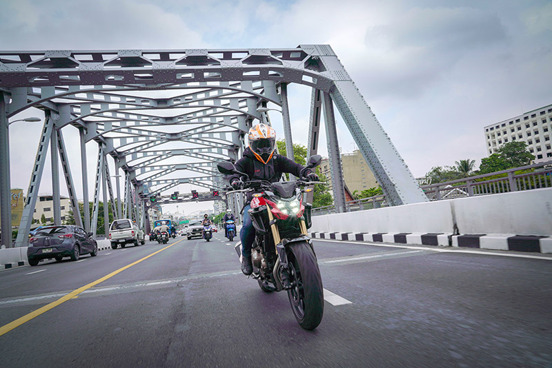 ในช่วงแรกของการรีวิว เราตั้งใจขี่ฝ่าการจราจรในกทม.เพื่อดูการควบคุมสำหรับสายใช้งานในเมือง ด้วยช่วงแฮนด์กว้าง 798 มม.ความสูงเบาะ 789 มม. กับท่านั่งมีปรับเล็กน้อย (ชุดพักเท้าใหม่เป็นอลูมิเนียมทั้งแป้น)