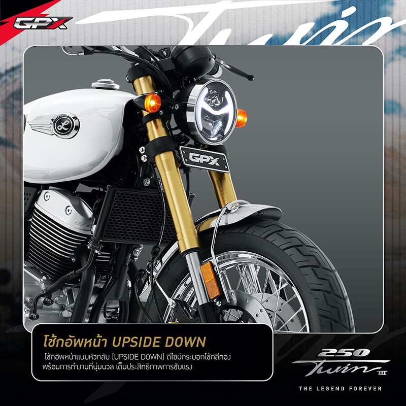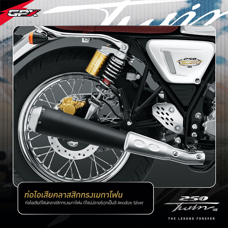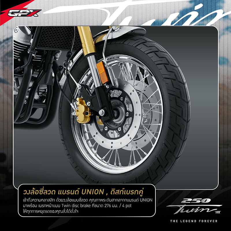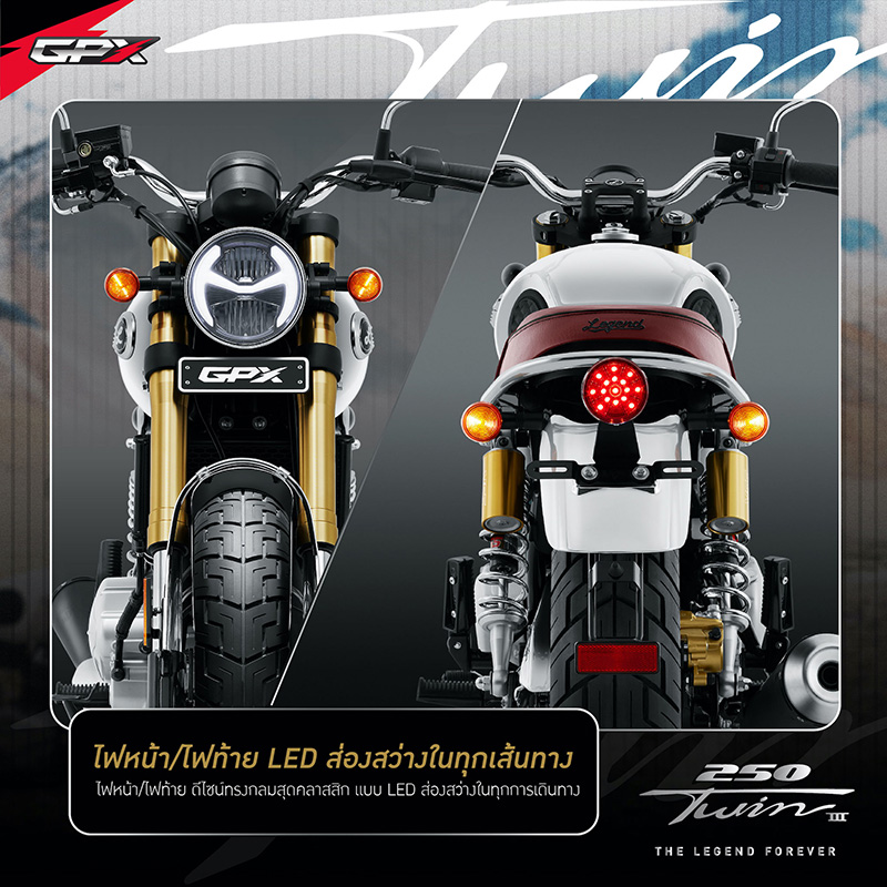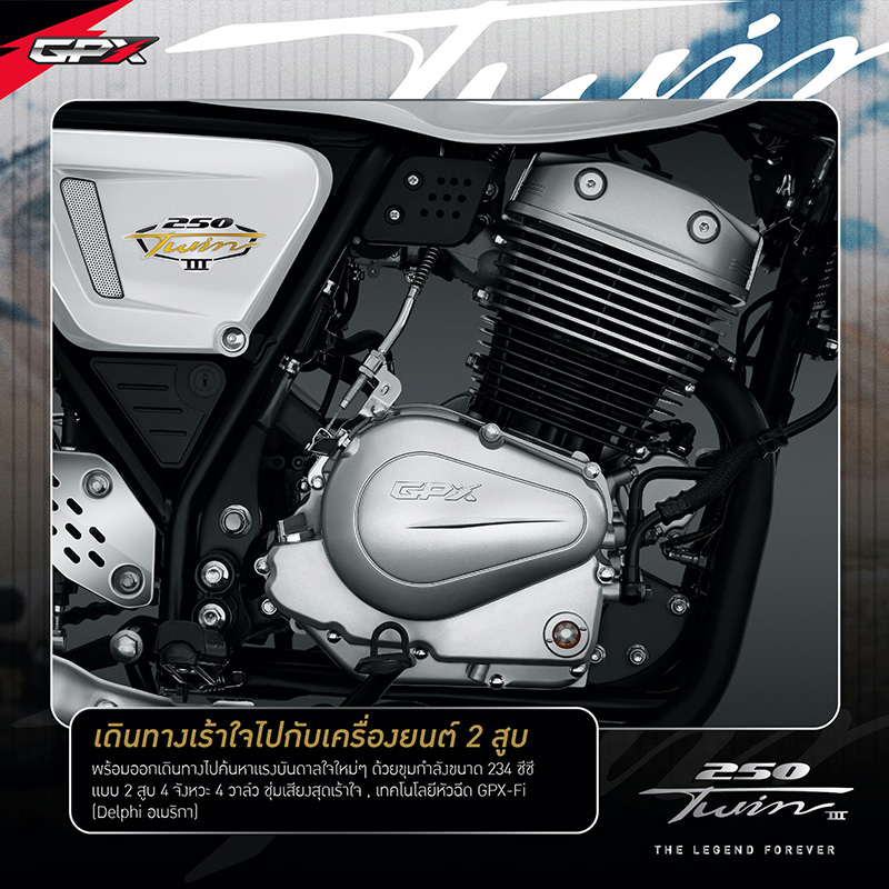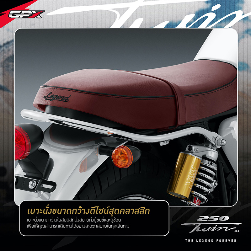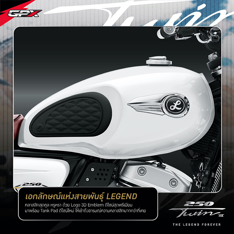 NEW LEGEND 250TWIN III โฉมใหม่! โดดเด่นด้วยดีไซน์สุดคลาสสิก กับการแมทซ์คู่สีที่ตัดกันของสีทองและโครเมียม เสริมให้ลุคใหม่นี้ เข้าถึงอารมณ์ความคลาสสิกแบบสุดขั้ว แถมยังเพิ่มความเก๋าแบบฉบับดั้งเดิมความคลาสสิกด้วยวงล้อแบบซี่ลวดดีไซน์สีโครเมียม คุณภาพระดับสากลจากแบรนด์ UNION พร้อมเสริมทัพด้วยฟังก์ชั่นแน่นๆเต็มลำ ที่พร้อมพาคุณออกเดินทางไปค้นหาแรงบันดาลใจใหม่ๆ ด้วยขุมกำลังขนาด 234 ซีซี แบบ 2 สูบ 4 จังหวะ 4 วาล์ว จ่ายน้ำมันเชื้อเพลิงด้วยเทคโนโลยีหัวฉีด GPX-Fi (แบรนด์ Delphi อเมริกา) พร้อมให้คุณออกเดินทางสร้างตำนานครั้งใหม่ได้อย่างเป็นอิสระ และส่งพลังการขับเคลื่อนด้วยโซ่คุณภาพ จากแบรนด์โซ่ชั้นนำ RK ที่ขนาด 520 แบบมี O-Ring ช่วยให้มีอายุการใช้งานยาวนานกว่าโซ่แบบธรรมดาถึง 2 เท่า นอกจากนี้ ยังดีไซน์บอดี้ตัวรถมาให้ตอบโจทย์ในการเดินทาง ด้วยท่านั่งที่สะดวกสบาย ง่ายทุกการคอนโทรลด้วยแฮนด์บาร์ในองศาที่รับกับช่วงแขน จะเดินทางไกลก็ไม่หวั่นเพราะมาพร้อมเบาะนั่งขนาดกว้างสัมผัสนุ่มสบาย ให้คุณเพลิดเพลินไปกับการเดินทางได้อย่างเต็มที่