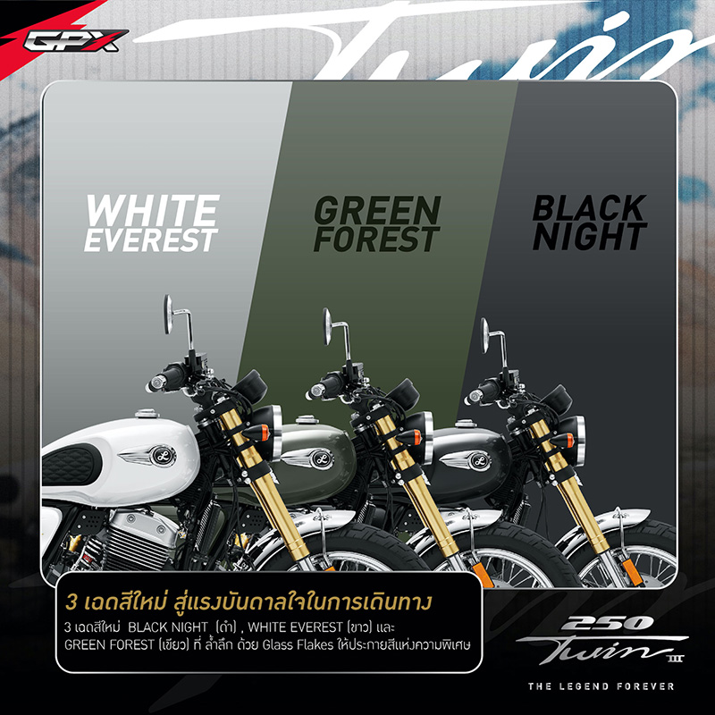 GPX ซุ่มเงียบ เปิดตัวโฉมใหม่ NEW LEGEND 250TWIN III ( สองห้าศูนย์ ทวิน มาร์ก ทรี ) ครั้งแรกที่ญี่ปุ่น! ก่อนเปิดจำหน่ายในไทย ในคอลเลคชั่นสุดพิเศษ สู่แรงบันดาลใจในการเดินทาง กับ 3 เฉดสีใหม่ ได้แก่ BLACK NIGHT เฉดสีดำ , WHITE EVEREST เฉดสีขาว และ GREEN FOREST เฉดสีเขียว ที่มาพร้อมวงล้อแบบซี่ลวด ให้เหล่าไบค์เกอร์ได้สัมผัสกับอารมณ์ความคลาสสิกอย่างเต็มสูบ!