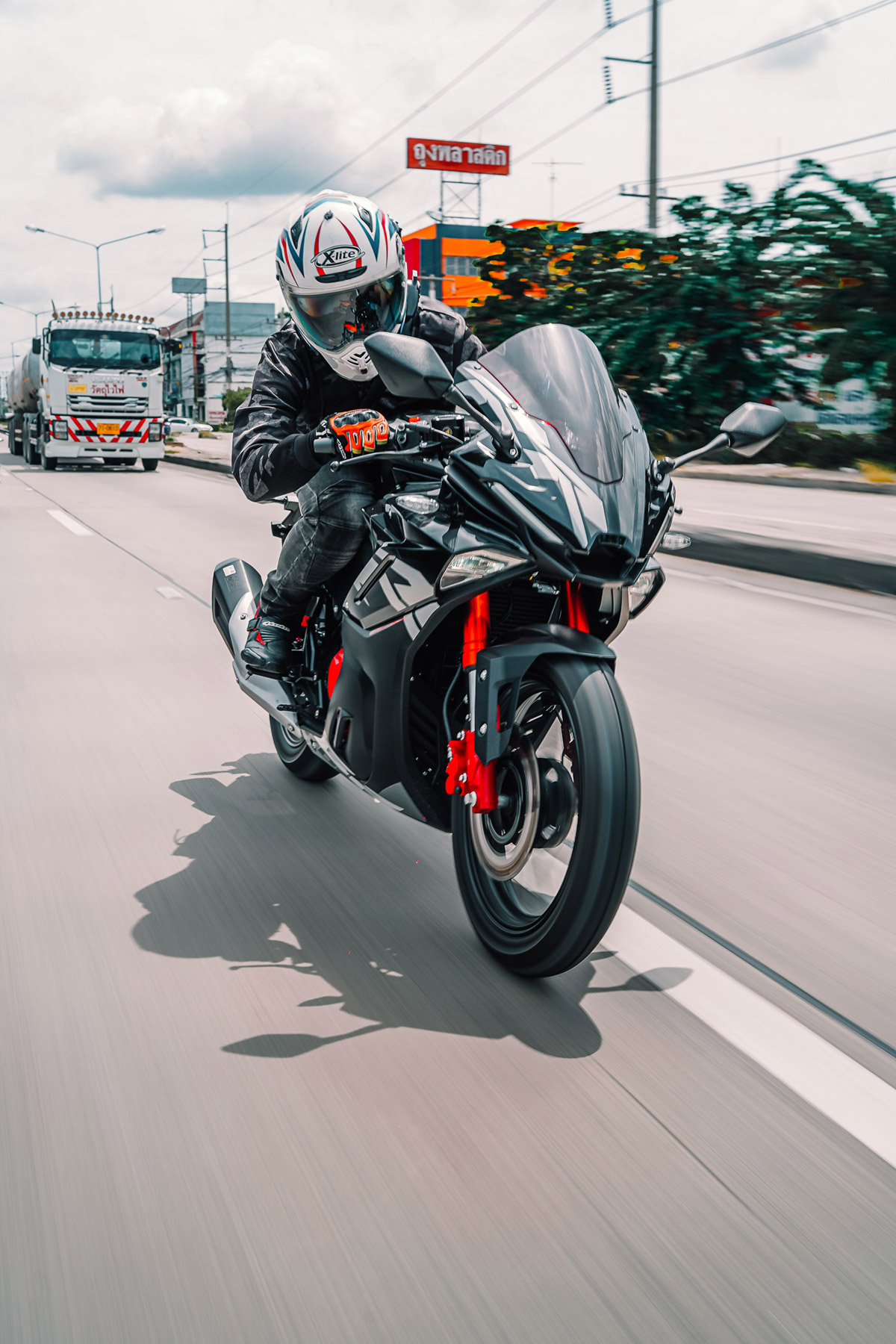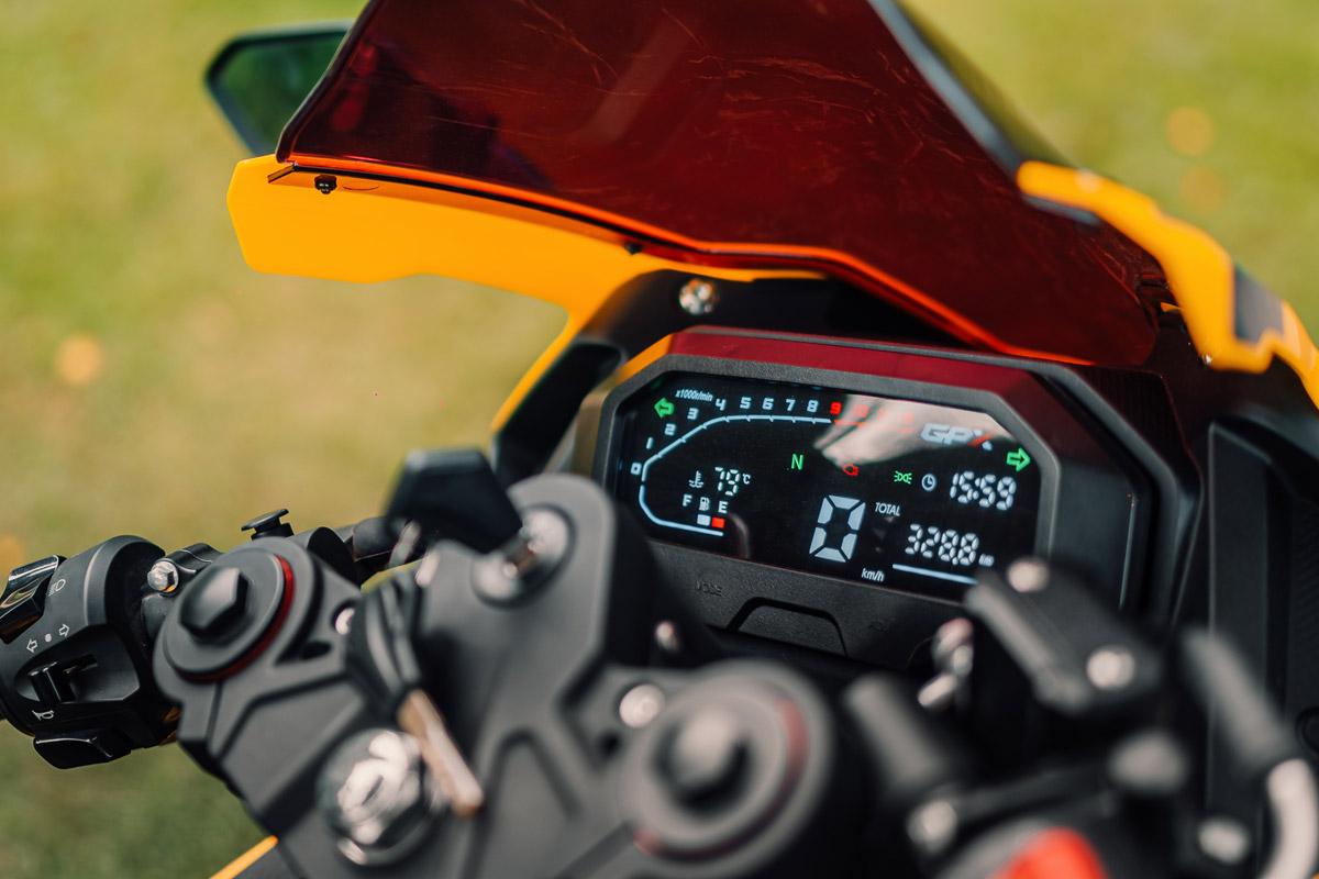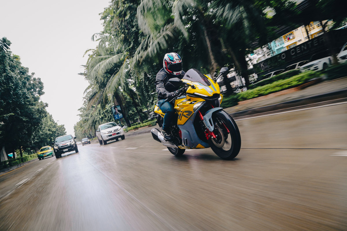 อีกหนึ่งเรื่องสำคัญคือฟีลลิ่ง “การควบคุม” นี่เอง …ด้วยมิติแบบสปอร์ต ทำให้การยื่นมือจับแฮนด์ผ่านถังน้ำมัน สอดรับกับตำแหน่งถังน้ำมันซึ่งเว้าให้เข่าหนีบได้พอดี ทั้งท่าขี่ปกติและ “หมอบ” …ผมลองแล้วอยากบอกว่าช่วงรถ “เหมาะ” แม้คนตัวเล็กก็ขี่ได้สบาย เบาะนั่งคนขี่สูง 815 มม. มีสเปซให้เลื่อนตัวไปด้านหลังจนถึงตำแหน่งเว้าแล้วหมอบหลบลมได้กระชับดี ฟีลลิ่งของแฮนด์จับโช้ค จุดนี้ใครเป็นสายหมอบ ถ้าอยากเอาลงก็ยังได้อีกพอสมควรเลย ตำแหน่งการขี่ยืนยันว่ารุ่นนี้ปรับโพสิชั่นให้สปอร์ตมากขึ้นกว่าตัวเก่าชัดเจน พักเท้าแบบเกียร์โยง เยื้องไปข้างหลังกว่าเวอร์ชั่นเก่าจัดท่าง่าย น้ำหนักรถ 155 กก. ถือว่าเบาได้พอเหมาะกับรถในขนาด 200 ซีซี. แบบนี้