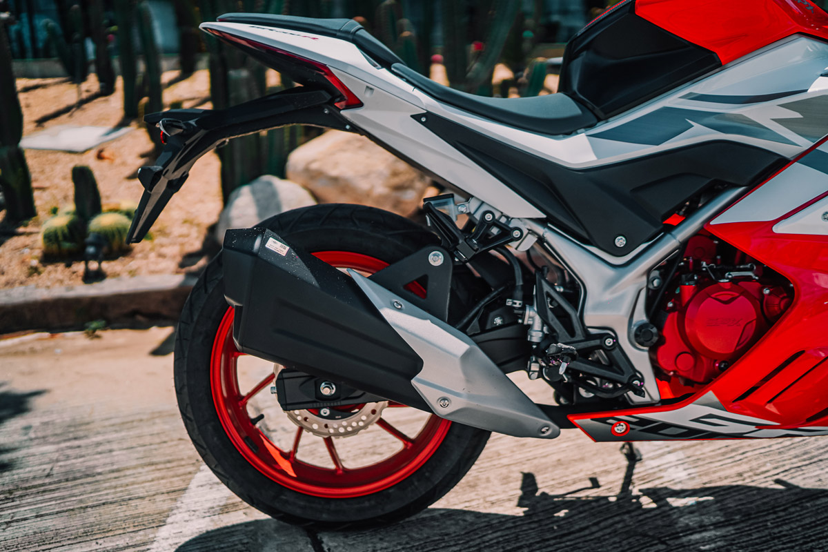 ทุกครั้งที่ทดสอบรถ ผมให้ความสำคัญกับออพชั่นเรื่องความปลอดภัยเป็นอันดับแรกๆเลยครับ สำหรับ GR200R 4V ทำได้ดีกับระบบเบรกแบบดิสก์หน้า-หลัง จานดิสก์หน้า 276 มม. หลัง 220 มม. ส่วนวงล้อแม็กขนาด 17 นิ้ว มาพร้อมยางแบรนด์ IRC หน้า : 100/80 -17″ (Tubeless) หลัง : 140/70 -17” (Tubeless) เอาตัวรอดได้สบายในสายใช้งานทั่วไป (ส่วนใครชอบเอาไปลงสนามก็อัพสเปคกันตามถนัด) ..อ้อ…รถรุ่นนี้ขับเคลื่อนด้วยโซ่ DID ขนาด 428 ซึ่งเป็นโซ่ O-Ring มั่นใจได้เรื่องอายุการใช้งานและเรื่องเสียงโซ่ที่ไม่ดังเหมือนรถแพงกว่า(บางรุ่น) ด้วยนะ