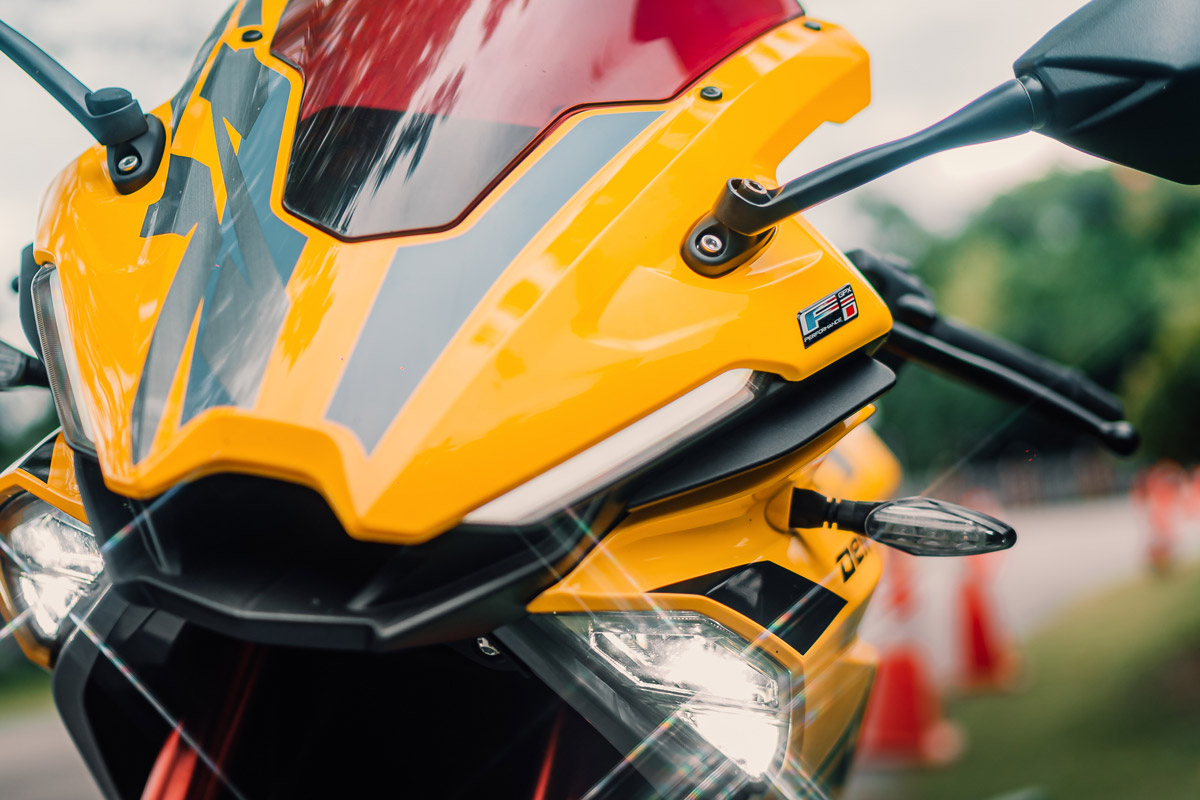 จุดสนใจแรกคือ “ภาพลักษณ์” ของมอเตอร์ไซค์สปอร์ตสีสันจัดจ้านแบบพวกตัวแข่ง Daytona ที่เราคุ้นตากัน ลึกลงไปกว่านั้น GR200R 4V ดีไซน์บอดี้ตามหลักแอโร่ไดนามิกฟูลแฟริ่ง ไม่ใช่แค่หล่อเฉยๆ นะ เนื่องจากเหลี่ยมมุมและครีบบนตัวรถมีส่วนในการรีดอากาศ วิ่งออกทริป ช่วงวิ่งความเร็วสูงรถก็ยังนิ่งดีมาก ไม่ต้านลม ไม่กระพือ ขณะเดียวกันชิลด์บังลมของรถก็ตัดลม มีประโยชน์มากกว่าแค่หล่อ!!