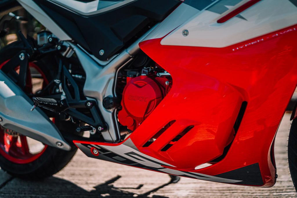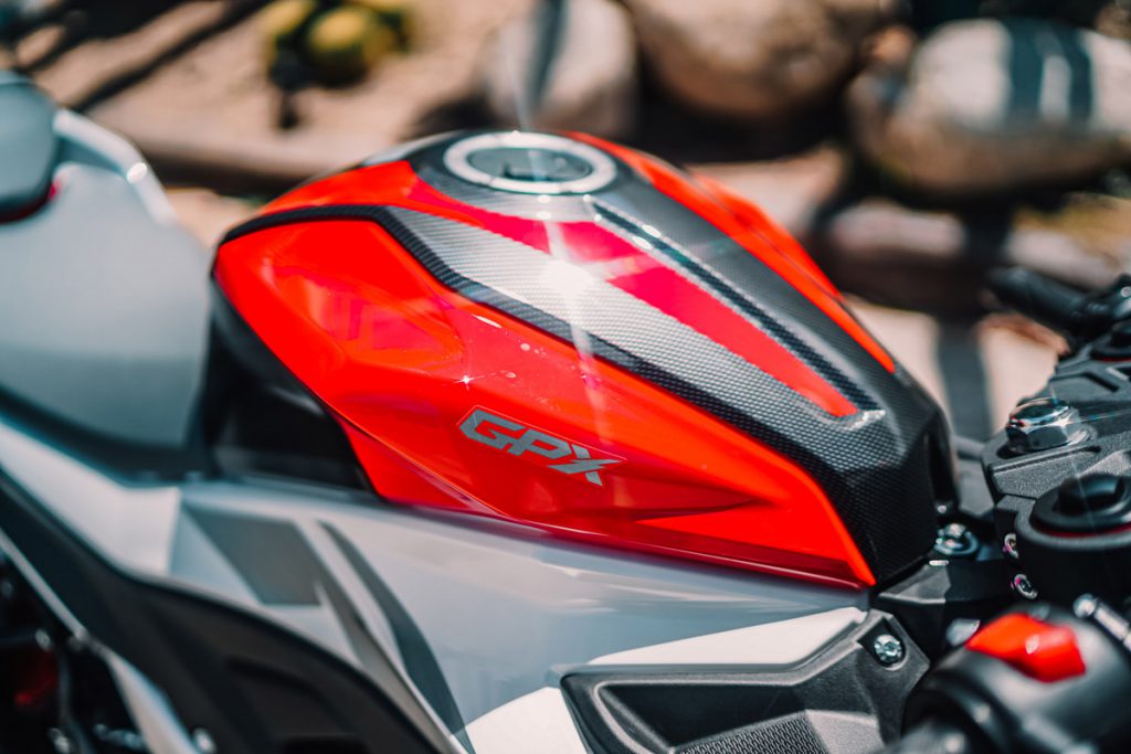 GPX ปล่อยรหัส “แคร้งค์แดง” สูบเดี่ยว แคมฯเดี่ยว จุดสำคัญคือเพิ่มวาล์วเป็น 4 วาล์ว!! หากเทียบเวอร์ชั่นก่อนเห็นว่าแรงบิดเพิ่มขึ้นเป็น 17.5 นิวตันเมตร / 19.1 แรงม้า (ลูก 65.5 ชัก 58.8) ปริมาตร 198 ซีซี. ระบายความร้อนด้วยหม้อน้ำ ระบบจ่ายเชื้อเพลิงหัวฉีด GPX FI แบรนด์ Delphi จากยูเอสเอ ทริปนี้ผมพบว่ากำลังเครื่องยนต์ แน่น กระชับ ติดมือ ต่อเกียร์ได้มันส์เกินคาด อัตราทดของ 6 เกียร์ ให้ช่วงมาชิดๆแบบสปอร์ต สังเกตว่า สเตอร์ 16-46 คาแรคเตอร์ ต้นได้ปลายไหลดีทีเดียว ทำท็อปสปีดได้ 145 กม./ชม.(จากหน้าปัด) ยังไปต่อได้อีก ที่สำคัญคือรอบเครื่องแตะเรดไลน์แล้วยังไม่ตัด…ภาพรวมเครื่องยนต์ถือว่าจัดจ้านพอตัว ส่วนตัวแอดฯคิดว่ารุ่นนี้ ใครมี เอามาปั้นต่ออัพสเต็ปเข้าท่าแน่นอน!!