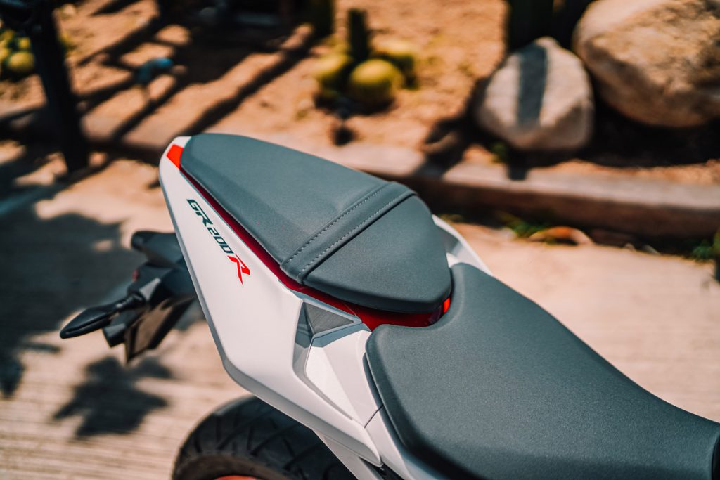 ระบบไฟส่องสว่าง ผมชอบมากที่ GPX วางชั้นเชิงการออกแบบได้เท่ดี ไฟหน้า build-in ฝังแยกส่วนไว้ที่ด้านข้างของตัวรถ แล้วยังมี DRL (Daytime running light) ลงตัว ไฟท้าย / ไฟเบรก ให้ภาพของความล้ำ อัตลักษณ์ของรุ่น GR200R ชัดเจน เรื่องระบบไฟไม่ใช่แค่สวยงาม เพราะในช่วงการเดินทางขากลับที่ขี่กลางคืนท่ามกลางสายฝน ความสว่างคมชัดของไฟทั้งระบบช่วยได้มากให้จบทริปอย่างปลอดภัย