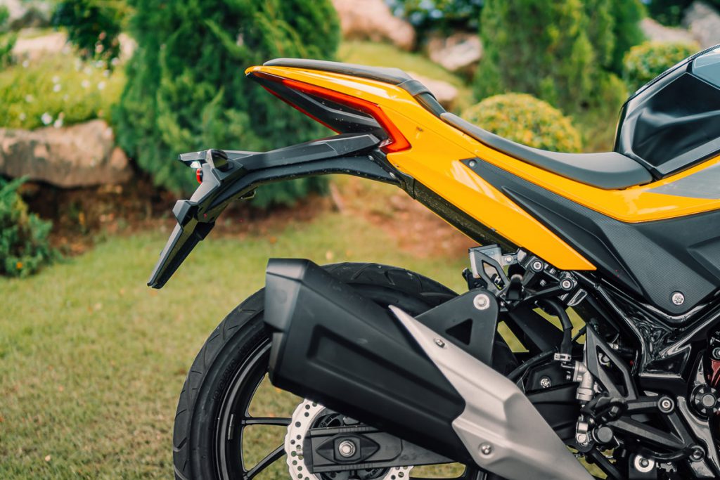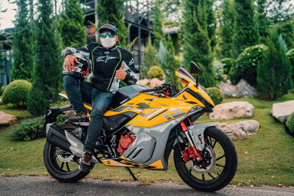 สังเกตว่า GR200R 4V เน้น “คู่สี” แมตช์กันทั้ง 3 เฉดสี ที่ได้ลองคือ เหลือง-เทา (วันนั้นขี่จอดติดไฟแดง ถึงกับมีคนข้ามถนนมาถาม ว่านี่ตัวใหม่ GPX หรา)