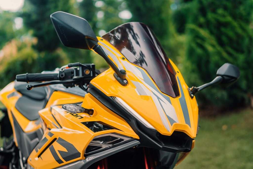 จุดสนใจแรกคือ “ภาพลักษณ์” ของมอเตอร์ไซค์สปอร์ตสีสันจัดจ้านแบบพวกตัวแข่ง Daytona ที่เราคุ้นตากัน ลึกลงไปกว่านั้น GR200R 4V ดีไซน์บอดี้ตามหลักแอโร่ไดนามิกฟูลแฟริ่ง ไม่ใช่แค่หล่อเฉยๆ นะ เนื่องจากเหลี่ยมมุมและครีบบนตัวรถมีส่วนในการรีดอากาศ วิ่งออกทริป ช่วงวิ่งความเร็วสูงรถก็ยังนิ่งดีมาก ไม่ต้านลม ไม่กระพือ ขณะเดียวกันชิลด์บังลมของรถก็ตัดลม มีประโยชน์มากกว่าแค่หล่อ!!