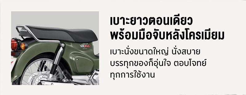 New Super Cub โดนเด่นด้วยสไตล์วินเทจที่ยังคงความออริจินัล ดีไซน์ไฟหน้า LED ทรงกลมและกระจกมองข้างเข้าคู่กันในแบบฉบับของ Super Cub พร้อมกับสีใหม่เพิ่มความโดดเด่นอย่าง “เขียว Pearl Organic Green” โมโนโทน และ “เทา-ขาว Pearl Cadet Gray” ที่หยิบคู่สีทูโทนมาเติมเสน่ห์ให้น่าสนใจมากขึ้น รวมถึงตัวเรือนไมล์สไตล์เรโทรผสานเทคโนโลยีแสดงผล ผ่านจอ Digital LCD