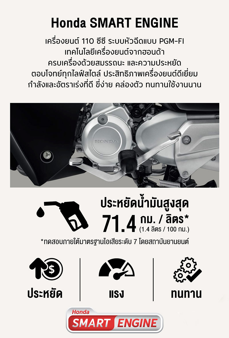 ขุมพลังจากเครื่องยนต์ Honda Smart Engine 110 ซีซี เทคโนโลยีที่ฮอนด้าพัฒนาเพื่อตอบโจทย์เรื่องการประหยัดน้ำมัน ทำงานร่วมกับระบบหัวฉีดแบบ PGM-FI ทำให้ประหยัดน้ำมันสูงสุดถึง 71.4 กิโลเมตร/ลิตร (มาตรฐานไอเสียระดับ 7 จากการทดสอบโดยสถาบันยานยนต์) อีกทั้งยังขับขี่ง่าย คล่องตัว ด้วยโครงตัวรถที่มีน้ำหนักเบา ทนทาน ตอบโจทย์การใช้งานได้อย่างเต็มประสิทธิภาพ