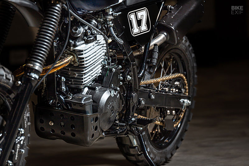 6.ระบบไอเสีย จัดมาเป็นท่อคู่ งานนี้นำชิ้นส่วนจาก Honda CRF250 และ XR600 ที่ได้รับการปรับแต่งมาอย่างพอดีเป๊ะประกอบขึ้นด้วยกัน