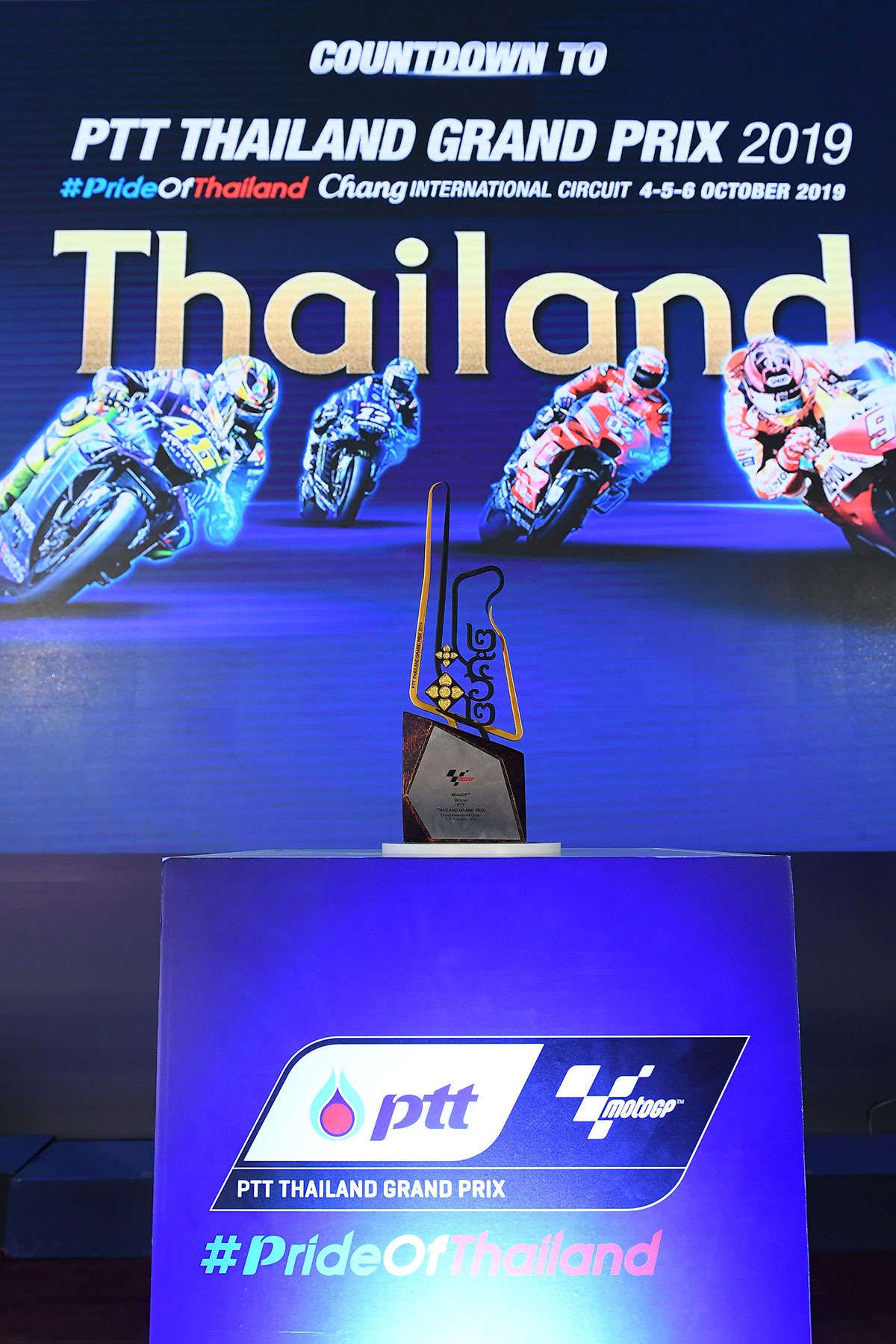 ไฮไลต์ของการแถลงข่าวคือการเปิดตัว ถ้วยรางวัล พีทีที ไทยแลนด์ กรังด์ปรีซ์ 2019 ซึ่งถือเป็นหนึ่งในสัญลักษณ์สำคัญของการแข่งขัน โมโตจีพี ในประเทศไทย ได้รับแนวคิดในการออกแบบโดยต่อยอด มาจากปีที่แล้ว ซึ่งออกแบบถ้วยให้คล้ายกับประตูวัดตกแต่งด้วยลายไทย เสมือนการเปิดบ้านต้อนรับชาวโลก เข้าสู่ประเทศไทยเป็นครั้งแรก โดยในปีนี้ ถ้วยรางวัลจะสื่อถึงความเชื่อมโยงของจังหวัดบุรีรัมย์มากขึ้น ผสมผสานเอกลักษณ์ของจังหวัดเข้ากับความเป็นโมโตจีพี ฐานของถ้วยรางวัลจำลองรูปแบบหินที่มีสี และเนื้อสัมผัสคล้ายกับศิลาแลงที่เป็นวัสดุในการก่อสร้างปราสาทหินพนมรุ้ง ตัดแต่งให้มีรูปทรงตาหมากรุกซึ่งเป็นสัญลักษณ์ของโมโตจีพี ด้านบนของฐานคือลายแทร็กของ สนามช้าง อินเตอร์เนชั่นแนล เซอร์กิต ที่มีรูปทรงเป็นเอกลักษณ์เฉพาะ ไม่เหมือนที่ใดในโลก ตกแต่งด้วยลายเลขไทย ซึ่งมีพื้นฐานมาจากดอกไม้ไทย สื่อถึงความยินดีกับผู้ชนะการแข่งขันที่ประเทศไทยในครั้งนี้