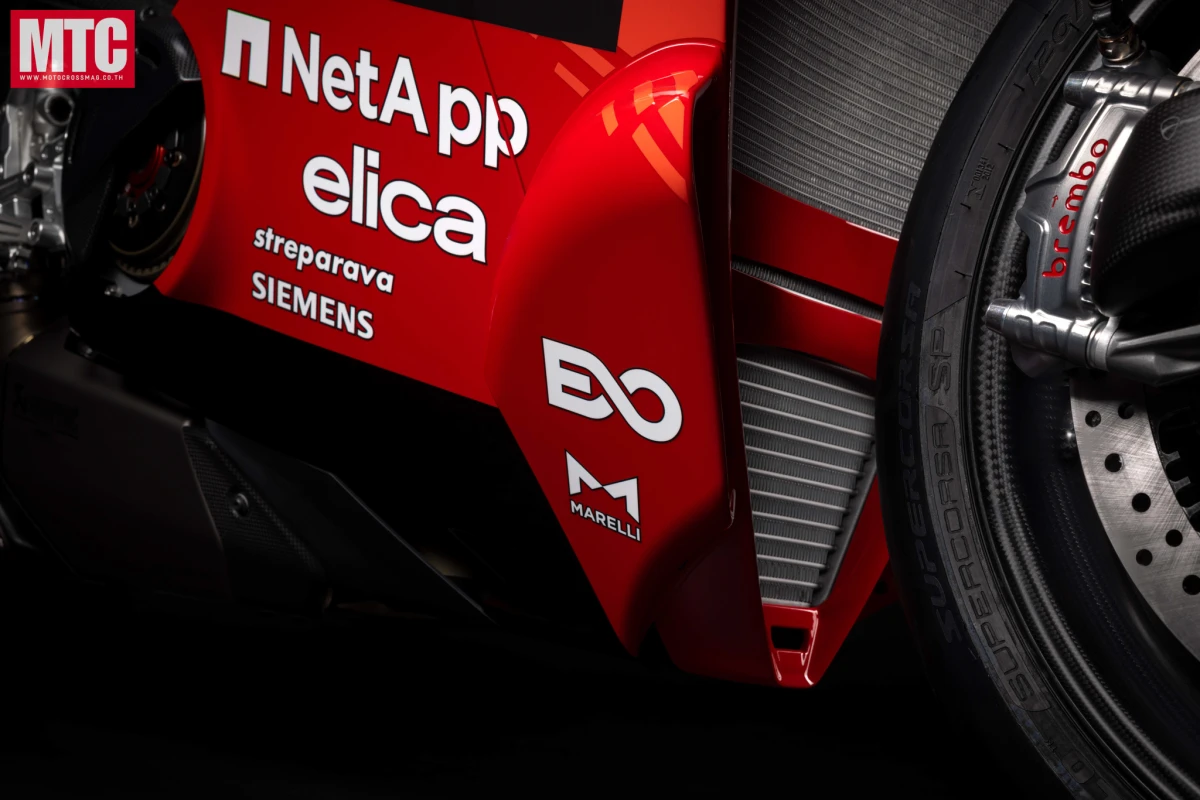 ด้านการออกแบบหรือดีไซน์ถอดแบบมาจากรถแข่งของเจ้ามดแดงแชมป์โลก MotoGP คนล่าสุด ทั้งสีสันและโลโก้สปอนเซอร์ โดยมีตัวต้นแบบเป็นเจ้า V4S ที่ออกแบบตามแอโรไดนามิกมีทั้งวิงก์เล็ตซึ่งช่วยสร้างแรงกดที่ล้อหน้า และคอร์เนอร์ไซด์พ็อดซึ่งช่วยสร้างกราวด์เอ็ฟเฟ็กต์เวลาเข้าโค้ง