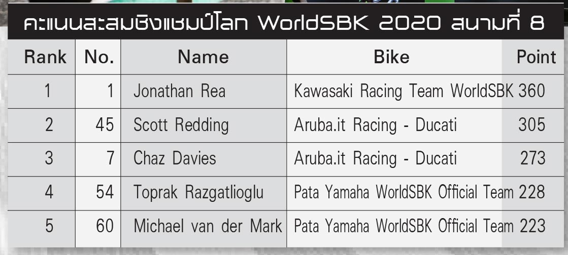 ยังเป็นศึกใหญ่ระหว่างค่ายเขียวและแดงที่สลับกันฟาดฟันด้วยตำแหน่งโพเดียมอย่างไม่หยุดยั้ง โดยในเรซ1 ตกเป็นของ #1 Jonathan Rea ท่ามกลางสายฝนอันหนักหน่วง ก่อนที่เรซ2 ฝ่าย Redding จะเอาคืน ซิวโพเดียมมาไว้ ต่อโอกาสเฉือนแชมป์ไปอีก 1 สนาม..