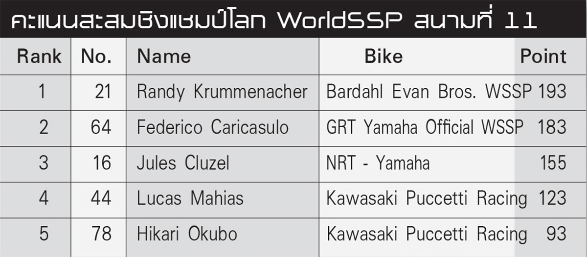 ถือเป็นการกลับมาขึ้นโพเดี้ยมอีกครั้งอย่างภาคภูมิของ Bautista ที่ครึ่งฤดูกาลหลังนั้นทำผลงานไม่ค่อยดีนัก จากเป็นผู้นำ(โด่ง) สู่ผู้ตามหลังกว่า 90 คะแนนในตาราง ซึ่งคงไม่ใช่เหตุการที่ Jonathan Rea คาดไม่ถึงจึงย้ำแต้มแบบเน้นๆ รวดทั้ง 3 เรซ