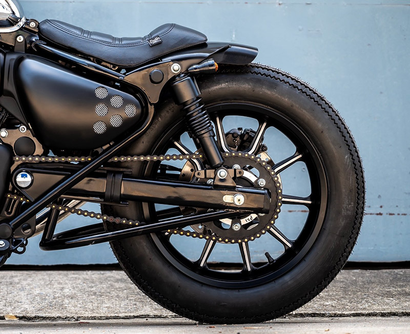 ตัวอย่างชิ้นส่วนประกอบที่สำคัญ ได้แก่ ไฟหน้า LED แบบคัสตอม และแฮนด์บาร์พร้อมสวิตช์และมือจับสไตล์เรโทร คลัตช์ และแม่ปั๊มเบรก Takegawa ถังเชื้อเพลิงโครเมียม เฟรมด้านหลังถูกตัดให้สั้นลง พร้อมเบาะหนังแท้เย็บมือ และบังโคลนหลังแบบ bobbed แบบลอยตัว
