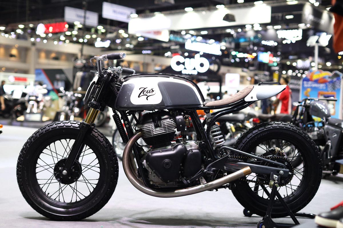 - Moose by Zeus Customคัสตอมขึ้นจากพื้นฐานของตัวรถคอนติเนนทัล จีที 650 ที่เป็นสไตล์ Café Racer แต่ทาง Zeus เอามาคัสตอมใหม่หมดจนแทบไม่เหลือเค้าเดิม แต่ยังให้กลิ่นอายความเป็นรอยัล เอนฟิลด์อยู่ โดยทางสำนักแต่งต้องการฉีกแนวให้รถคันนี้ไม่เหมือนใคร จึงเลือกให้รถคันนี้ออกมาเป็นสไตล์ Flat-track ที่เป็นรถที่ออกแบบมาเพื่อแข่งบนสนามดินทางเรียบ เน้นความเป็นงาน Handcraft สไตล์ Zeus ด้วยโครงรถมีความโค้งมนสอตดรับกับท่อไอเสียที่โค้งอ้อมใต้เครื่องยนต์ เสริมดีเทลด้วยปลายท่อทองเหลือง ด้านท้ายของตัวรถทำขึ้นใหม่หมดให้เหลือโช้คตัวเดียว ตัวถังมาในสีเรียบหรูขาวมุกตัดด้วยเทาเข้ม เมื่อมองจากด้านหน้า ตัวแฮนด์เดิลบาร์ของรถคันนี้ดูคล้ายเขาของกวางมูส จึงเป็นที่มาของชื่อรถสุดแนวว่า “Moose”