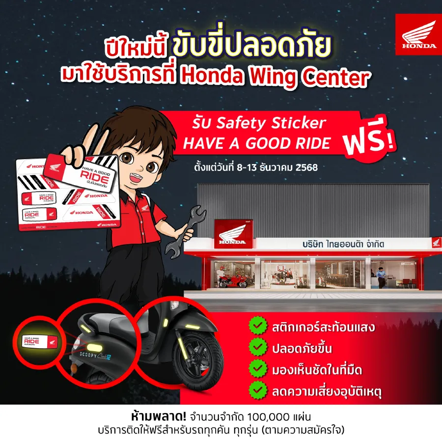 เพียงคุณนำรถมอเตอร์ไซค์ฮอนด้าคันโปรด ไม่ว่าจะเป็นรุ่นไหนก็ตาม เข้ามารับบริการที่ศูนย์บริการ Honda Wing Center ในวันที่ 8-13 ธันวาคม 2568 ก็รับไปเลย! Safety Sticker เพื่อส่งเสริมความปลอดภัยในการขับขี่ตอนกลางคืน จำนวนจำกัด 100,000 แผ่น ✨