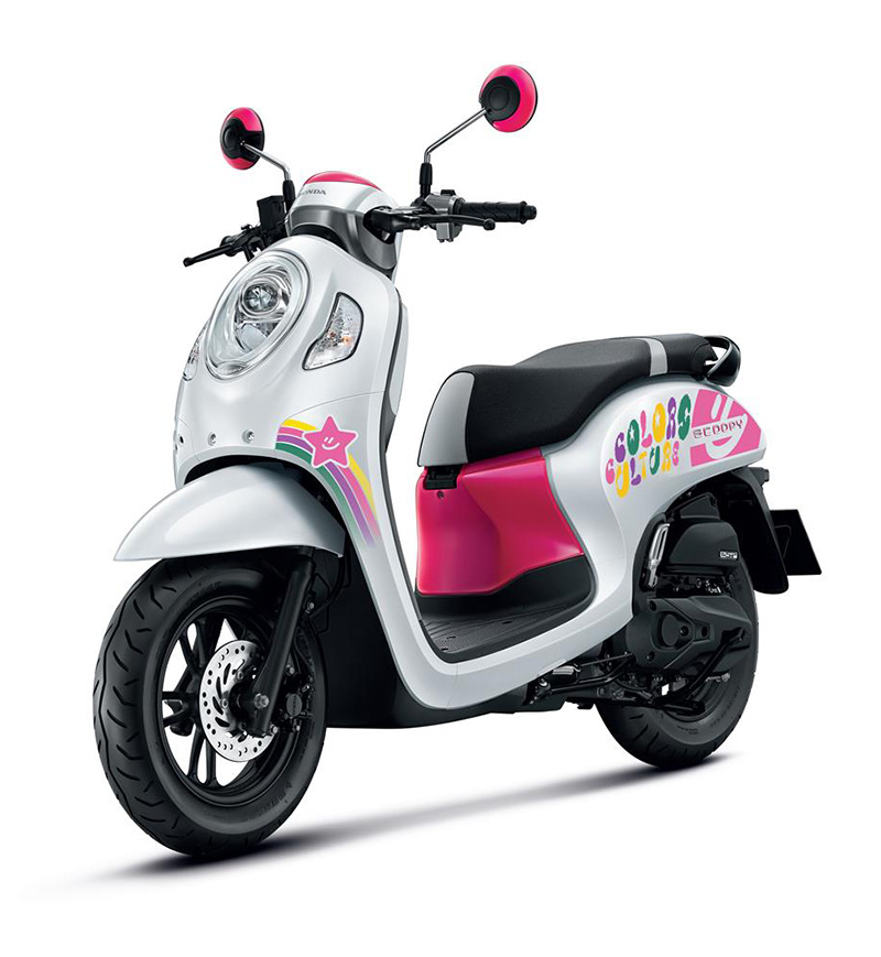 Honda Scoopy Colors Culture Limited Edition โดดเด่นสะดุดตาทุกมุมมองในสไตล์รถระดับ Iconic ของวัยรุ่น ผสานความสดใสของสีสันและเส้นสายเอกลักษณ์ที่เป็น Signature ของแบรนด์ Colors Culture บนตัวรถสีขาว – ชมพู สะท้อนความซุกซน ขี้เล่น ในสไตล์ของ พีพี กฤษฏ์ ที่รวมเอาสตรีทแฟชั่นและความคัลเลอร์ฟูลเข้าไว้ด้วยกันอย่างลงตัว สามารถแมทรถเข้ากับการแต่งตัวได้หลากหลายรูปแบบตามไลฟ์สไตล์ของผู้ใช้