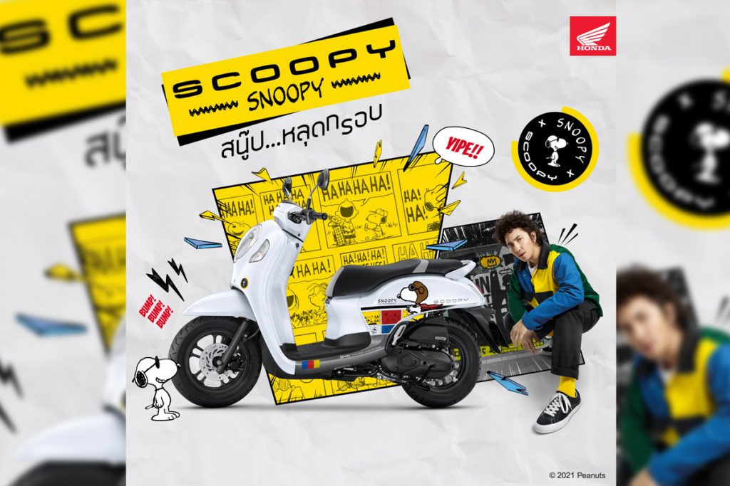 ผสานความสนุกและความกวน Scoopy ไอคอนรถจักรยานยนต์ที่เต็มไปด้วยความสนุก และ Snoopy ไอคอนการ์ตูนที่เป็นสัญลักษณ์ของความกวน หลุดกรอบจากการ์ตูน 4 ช่องของหนังสือพิมพ์อเมริกัน ส่งมอบความมันส์