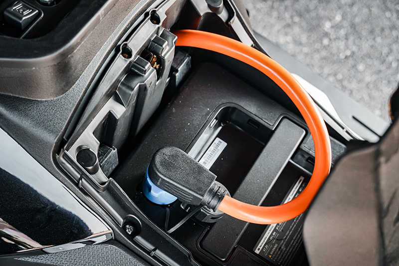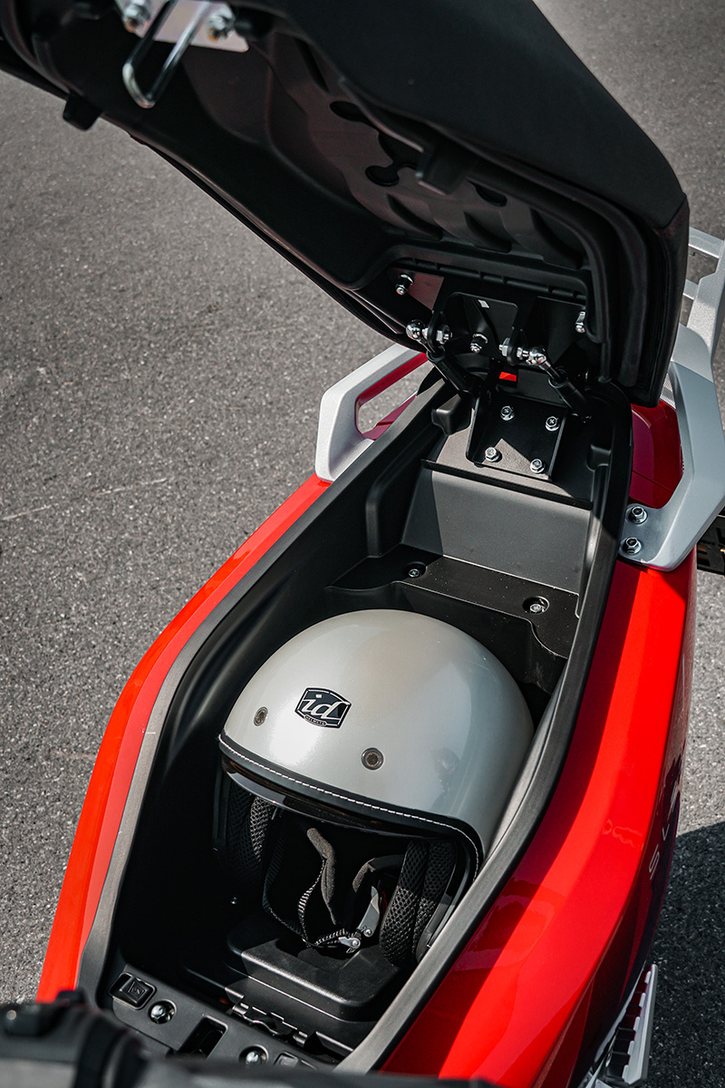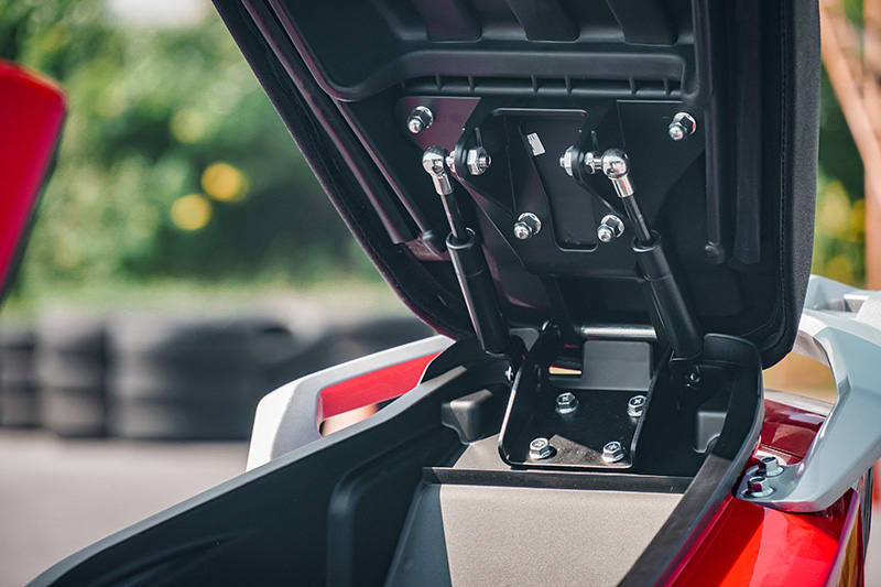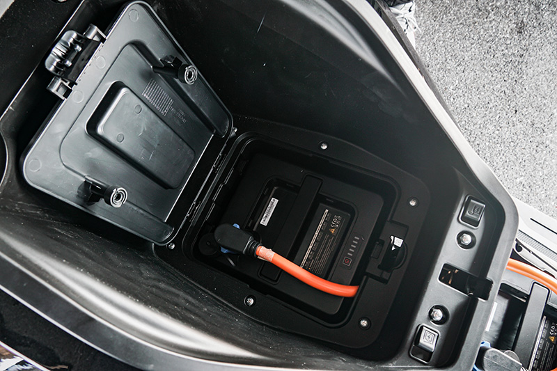 9. ช่องเก็บของใต้เบาะ ใส่หมวกกันน็อคครึ่งใบขนาดย่อมได้ 1 ใบ การเปิดเบาะกดจากปุ่มสมาร์ทคีย์ และมีโช้คค้ำเบาะเพื่อความสะดวกในการจัดการกับแบตฯ โดยสามารถถอดแบตฯในตำแหน่งใต้เบาะออกเพิ่มพื้นที่ใช้สอยได้ในกรณีที่จำเป็น แน่นอนมี ช่องจ่ายไฟแบบ USB Type-A ให้พร้อม