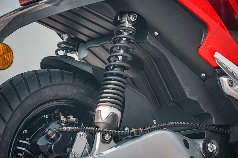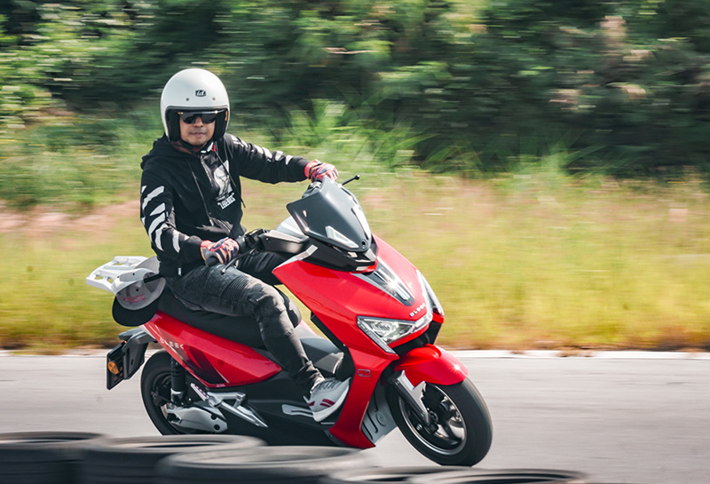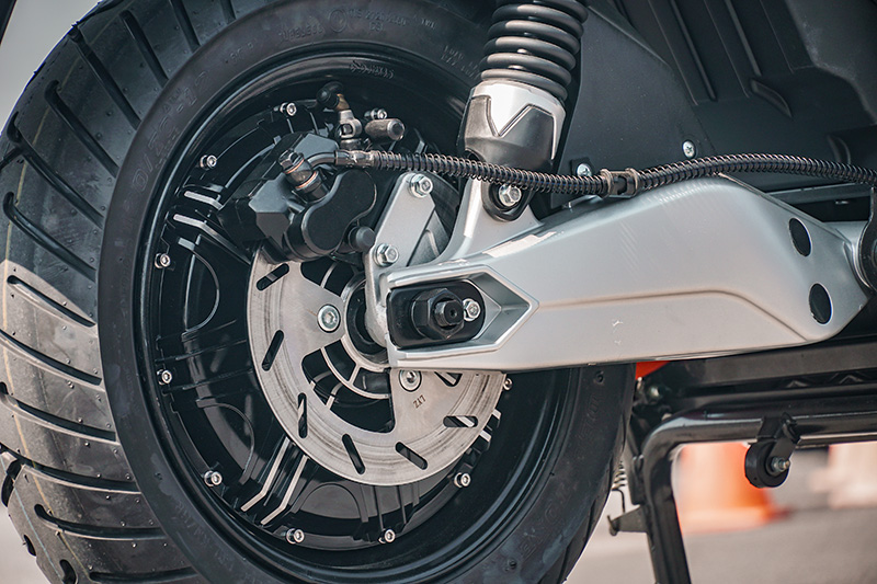 2. การขับเคลื่อน มี 3 โหมด ได้แก่ 1 – 2 – 3 ซึ่งการถ่ายทอดกำลังทำโดย “ฮับมอเตอร์ไฟฟ้า” ขนาด 3,000 วัตต์ ( 3 KW) ที่ล้อหลัง …จากที่ลองในแทรค โหมด 1 คือการขับขี่แบบเซฟพลังงาน ได้ความเร็วสูงสุดราวๆ 45 กม./ชม. จากนั้นในโหมด 2 วิ่งความเร็วประมาณ 50-55 กม./ชม. ส่วนในโหมด 3 ทำความเร็วสูงสุดได้ 80 กม./ชม. ย่านกำลังที่ออกมาตามการเปิดคันเร่ง เน้นไปที่ความสมูทไม่มีอาการกระชากครับ ถ้าสายซิ่งอาจจะต้องไปโมฯเพิ่มเอา!!