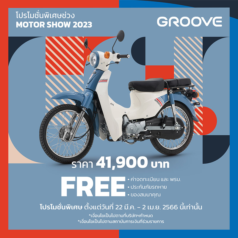 • GROOVE CROSS 125 : ได้เวลาออกนอกเส้นทาง…พร้อมที่จะเปลี่ยนรูปแบบการเดินทางแบบเดิมๆให้แตกต่าง ด้วยดีไซน์ตกแต่งพิเศษ ดุดันสายลุยตัวจริง มาพร้อมฟังก์ชั่นที่ตอบโจทย์ผู้ชื่นชอบการเดินทางด้วยโช้คอัพยกสูง ราคาสุดพิเศษที่ 43,900 บาท ฟรี!!! ค่าจดทะเบียน พรบ.และประกันรถหาย พร้อมของสมนาคุณ