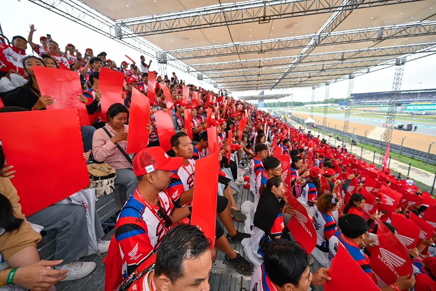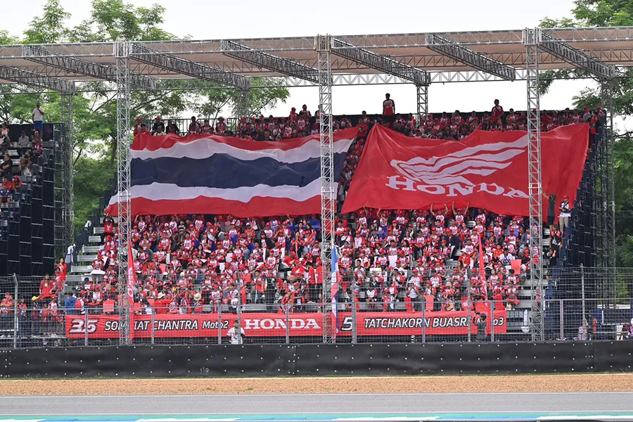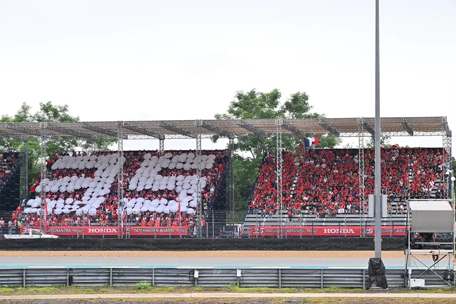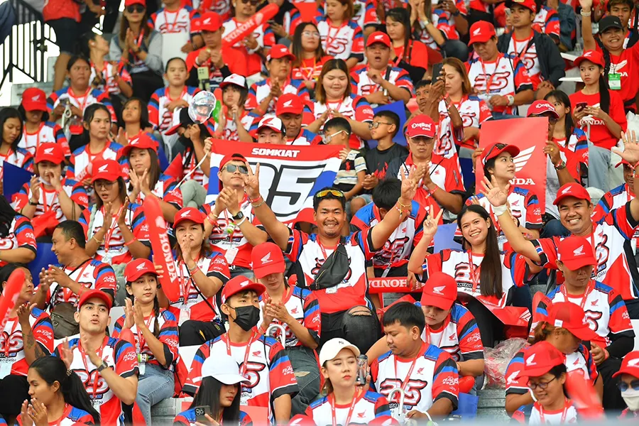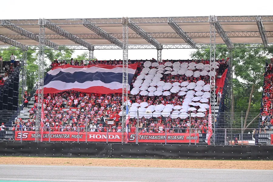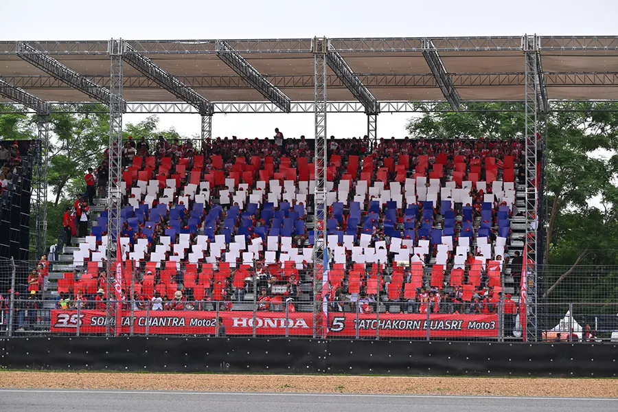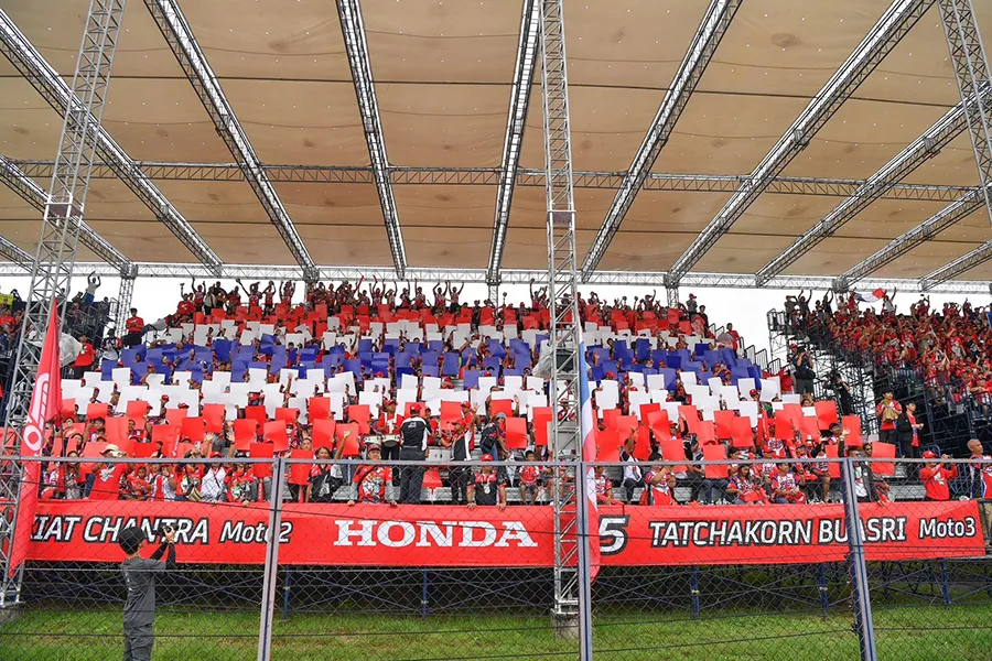 ”จันทรา สแตนด์“ และ “ฮอนด้า สแตนด์ ” สร้างปรากฏการณ์กองเชียร์อย่างยิ่งใหญ่ เต็มรูปแบบสู่สายตาชาวโลก รวมพลังแฟนชาวไทยส่งพลัง แรงใจ ให้ 2 นักบินไทย ทั้ง “ก้อง-สมเกียรติ” และ “ก๊องส์-ธัชกร” พร้อมอุปกรณ์เชียร์ครบมือ ด้วยการโชว์ปล่อยธงชาติไทยผืนยักษ์ และป้ายสีแปลอักษร พร้อมเทคนิคการกางร่มสลับสีเป็นหมายเลข 35 ของ “ก้อง” สมเกียรติ จันทรา ยอดนักบิดฮีโร่ชาวไทยในรุ่นโมโตทู จาก อิเดมิตสึ ฮอนด้า ทีม เอเชีย และ “ก๊องส์” ธัชกร บัวศรี ดาวรุ่งนักบิดไทยในรุ่นโมโตทู เจ้าของหมายเลข 5 จาก ฮอนด้า ทีม เอเชีย