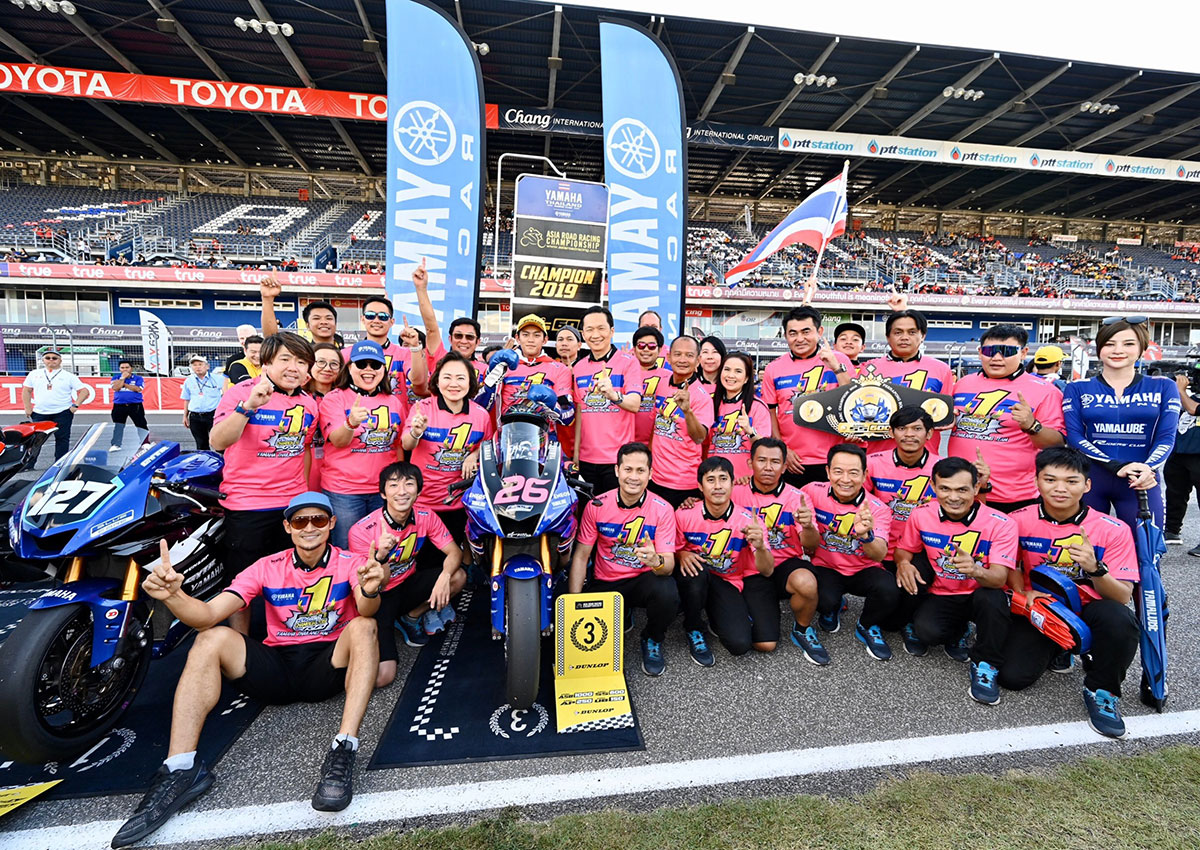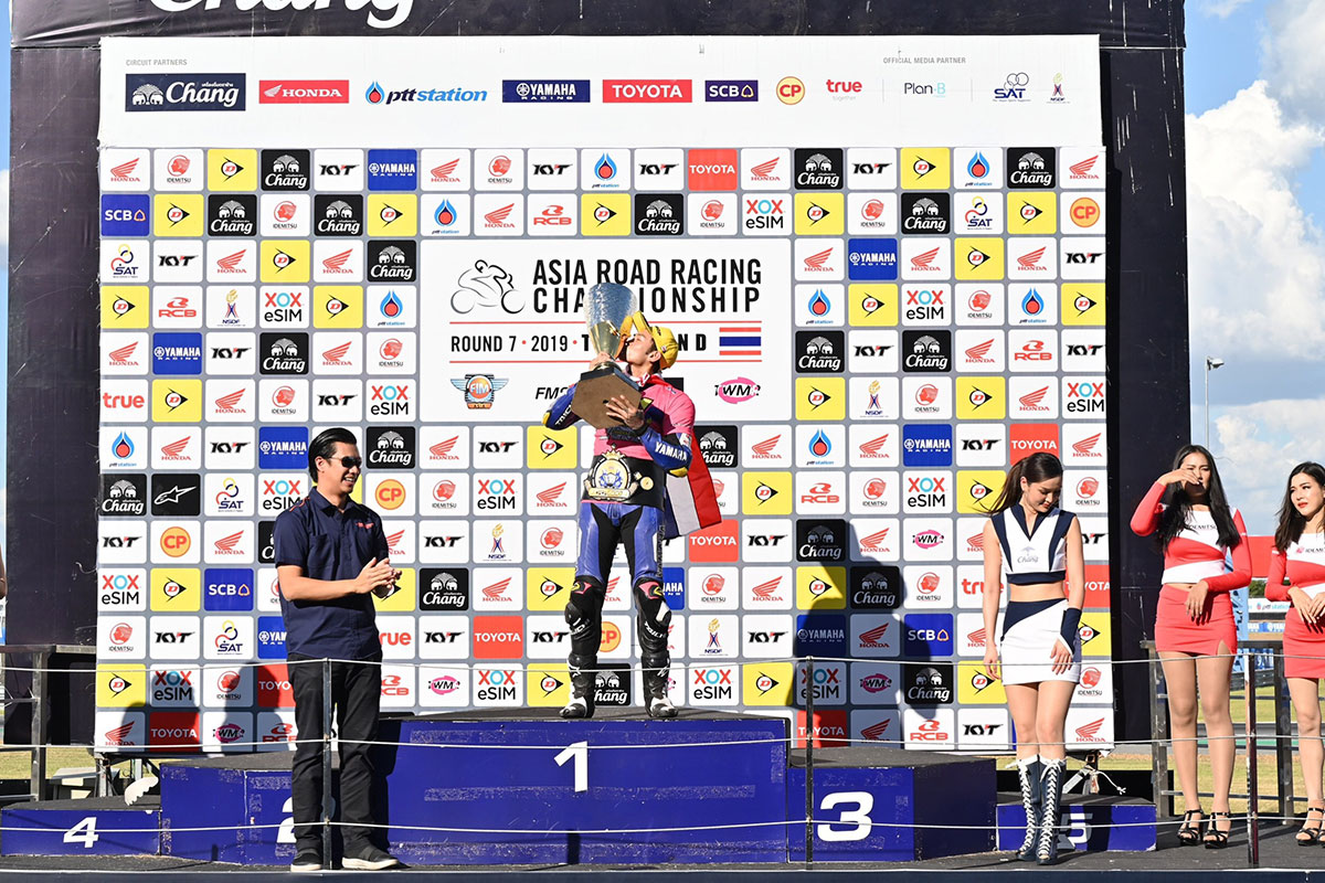 “ต๋ง – พีรพงศ์ บุญเลิศ” #26 นักบิดสังกัดทีม ยามาฮ่า ไทยแลนด์ เรซซิ่งทีม “แชมป์เอเชีย” ลงทำศึกชิงแชมป์เอเชียรุ่น Super Sports 600cc รายการ Asia Road Racing Championship 2019 สนามที่ 7 เรซ 2 ขับเคี่ยวคู่แข่งแบบสุดมันส์จนถึงโค้งสุดท้าย ก่อนกระชากคันเร่งรถแข่ง YZF-R6 ทะยานเข้าเส้นชัยผงาดยืนโพเดี้ยมอันดับที่ 3 พร้อมเฉลิมฉลอง “แชมป์เอเชีย” ต่อหน้ากองเชียร์ชาวไทยอย่างยิ่งใหญ่