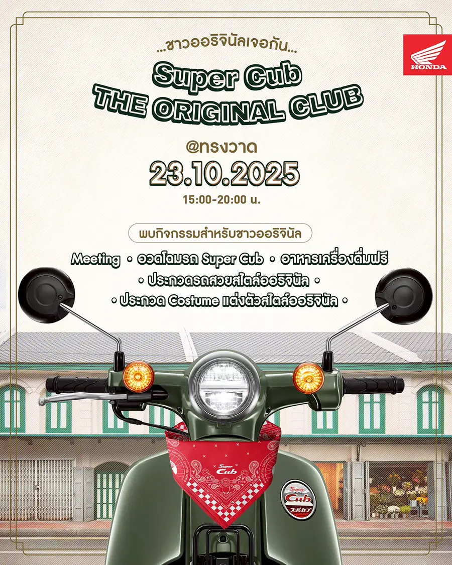 เตรียมตัวให้พร้อม แล้วมาสัมผัสบรรยากาศคลาสสิกสุดอาร์ตและร่วมเป็นส่วนหนึ่งของการเฉลิมฉลองความออริจินัลไปพร้อมกันในงาน “Super Cub THE ORIGINAL CLUB MEETING” เข้าร่วมงานได้ฟรี! ไม่จำเป็นต้องมีรถมอเตอร์ไซค์ก็ร่วมได้ ลงทะเบียนออนไลน์ได้ที่ 👉 https://bit.ly/46Shfuu