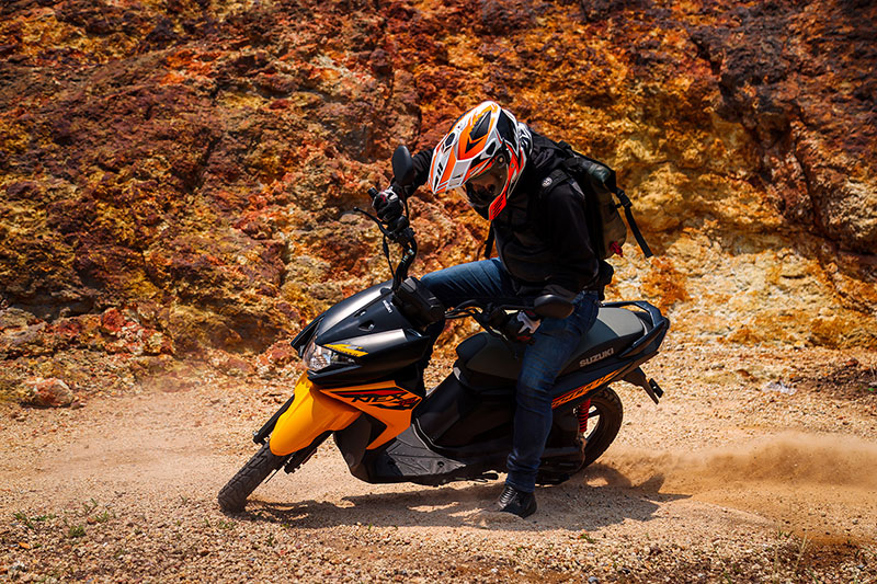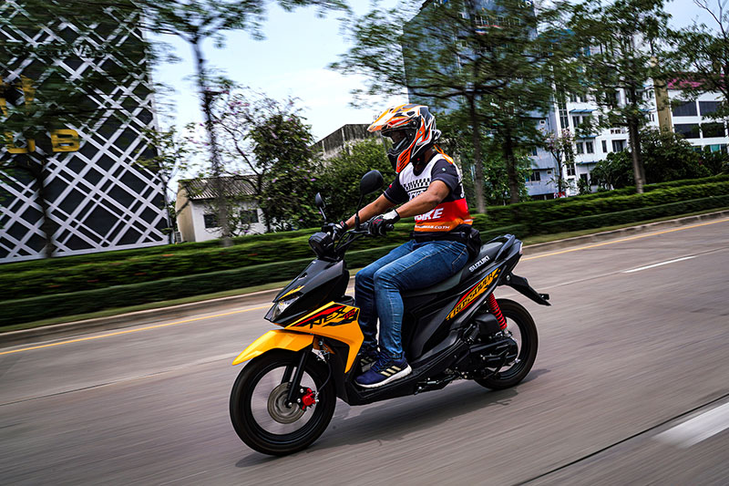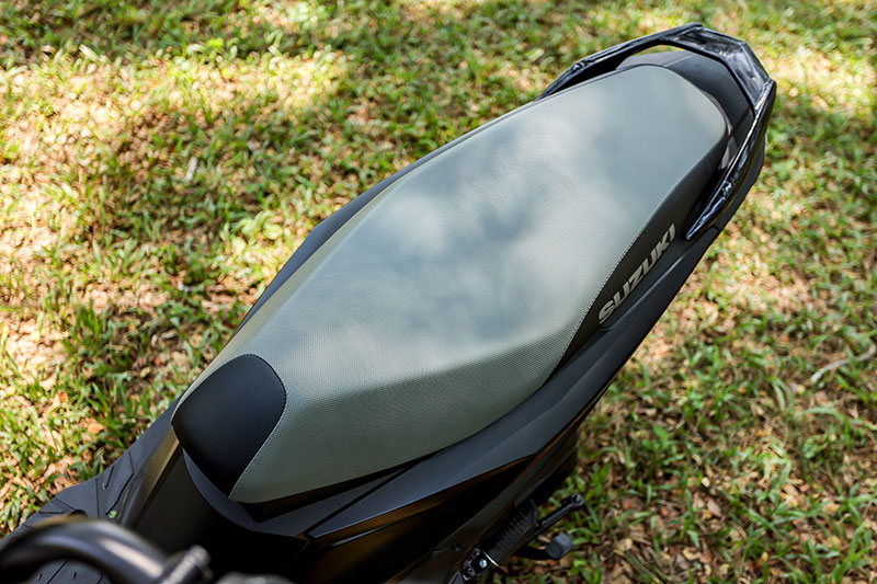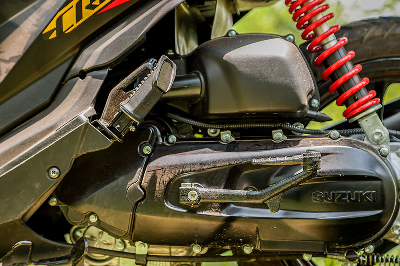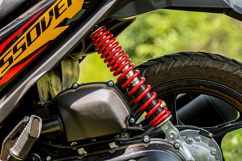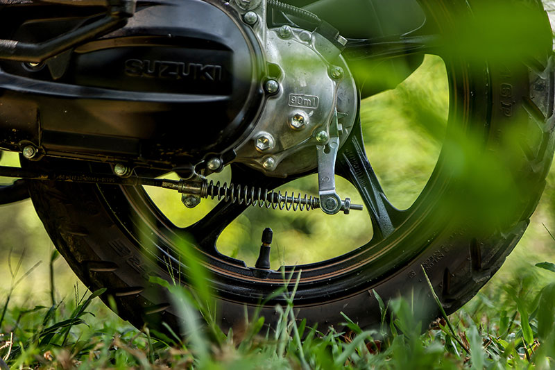 ด้วยตัวตนของมอเตอร์ไซค์ Crossoverดังนั้นจึงมีอีกจุดที่ซูซูกิทำได้ดีมาก นั่นคือ “ระบบช่วงล่าง” ที่ดูจากภายนอกอาจคิดว่าเป็นเทเลสโคปิคธรรมดากับโช้คหลังยูนิตสวิง(สปริงแดง)ที่เหมือนรถออโตฯทั่วไป แต่เอาเข้าจริงฟิลลิ่งในทุกสภาพทางมันกลับให้ความรู้สึกของการซับแรงสะเทือนได้อย่างน่าทึ่ง ทางดำขี่สบาย ซ้อนสองยังนุ่มนวลไม่มีโคลงเคลง ส่วนในเส้นทางพังๆที่ทริปนี้ได้ขี่ค่อนข้างเยอะ ช่วงล่างชุดนี้เอาอยู่สอดรับไปได้สวยกับยางติดรถแบบจุ๊บเลสSemi Block (ล้อแม็กขอบ14) ที่ให้บั้งใหญ่มาพร้อมลุยแถมยังเกาะถนนสภาพปกติได้น่าพอใจ