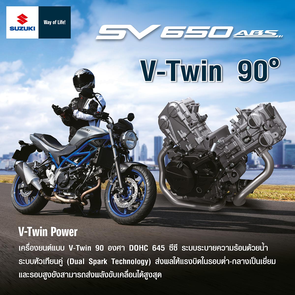 พลาดไม่ได้แล้วกับ Suzuki SV650 ABS ที่จะมาส่งท้ายโปรโมชั่นความคลาสสิกกับถึง 31 พฤษภาคม 2563 นี้กันเท่านั้น ด้วยรูปลักษณ์เฉพาะตัวตัวถังเป็นแบบเฟรมถัก ไฟทรงกลม ชุดแผงหน้าปัด Full LCD ปรับแสงสว่างได้ 6 ระดับ แสดงผลมาตรวัดรอบเครื่องยนต์, ตำแหน่งเกียร์, ความเร็วและอัตราการสิ้นเปลืองน้ำมัน  และพร้อมด้วยเทคโนโลยีที่ทันสมัยเพื่อการตอบสนองอัตราเร่งได้อย่างสนุก ขับเคลื่อนด้วยเครื่องยนต์แบบ V-Twin 90 องศา DOHC 645 ซีซี ระบายความร้อนด้วยน้ำที่จะช่วยเครื่องยนต์มีประสิทธิภาพอย่างเต็มรูปแบบ  และส่งผลให้มีแรงบิดในรอบต่ำและกลางมีความต่อเนื่อง รวมไปถึงรอบสูงที่สามารถส่งกำลังเครื่องยนต์ออกไปได้อย่างเต็มกำลัง พร้อมกับได้นำเทคโนโลยีในการใช้หัวเทียนคู่ (Dual Spark Technology) มาใช้เพื่อการเผาไหม้ที่สมบูรณ์ และช่วยให้ประหยัดน้ำมันเชื้อเพลิงได้ดี