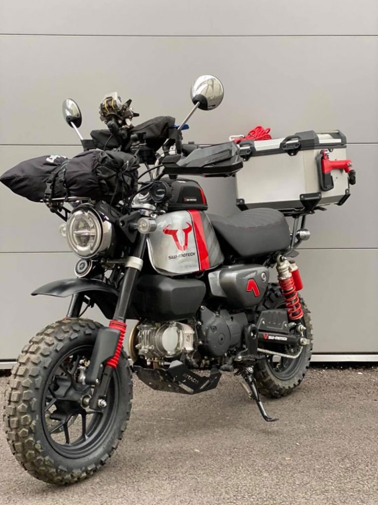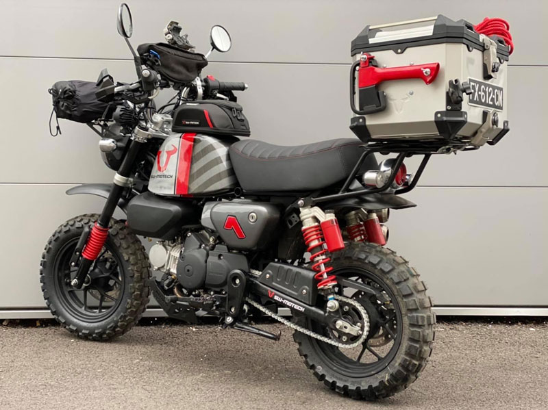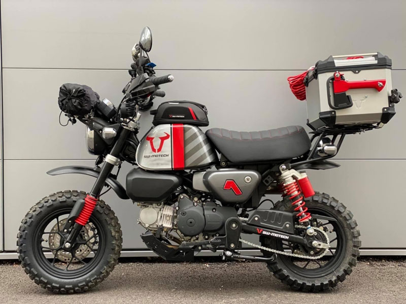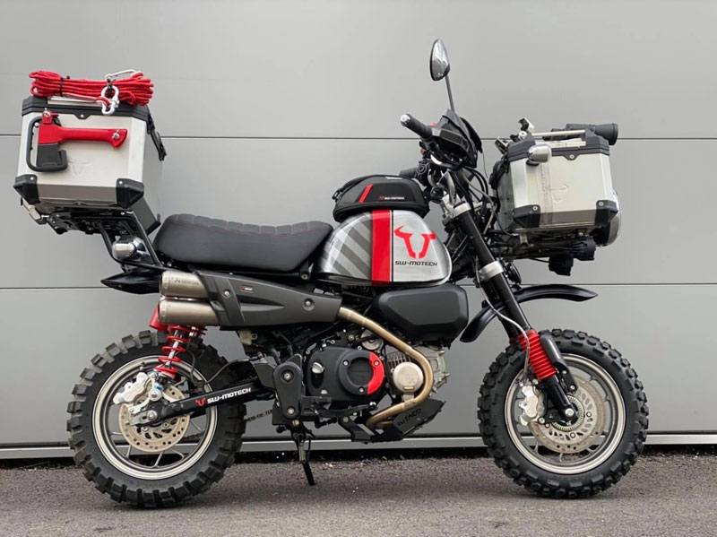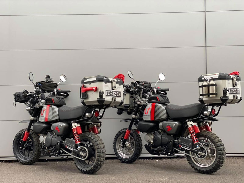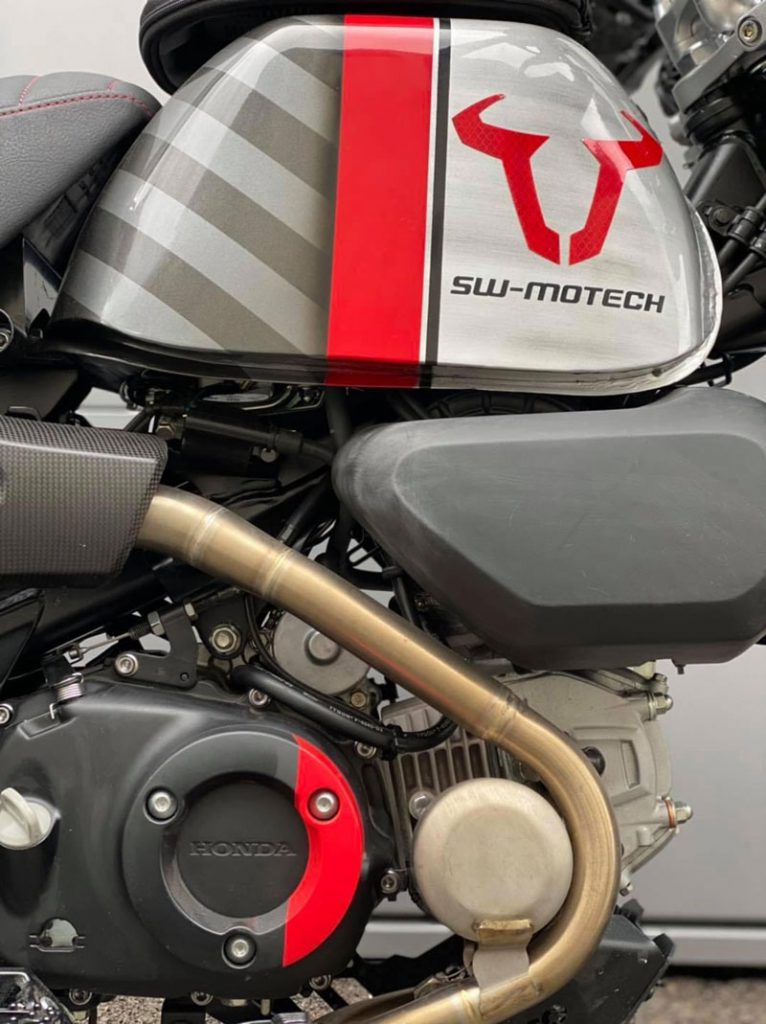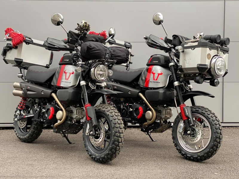 งานตกแต่งมังกี้ทั้งคู่ให้ออกมาในธีมของ SW-MOTECH ไม่ใช่แค่แปะสติ๊กเกอร์ เพราะรื้อออกแยกส่วนทั้งคัน แล้วจับถังน้ำมันไป “ทำสี” ใหม่หมด ท่อใช้ Akrapovic ยกสูงแนวสแครมเบลอร์ ทำเท่ให้ออกปลาย 2 ท่อล้อขอบ 12 อาบสีดำสนิท สลับไปเล่นยางบั้งใหญ่จากKENDA จากนั้นเปลี่ยนคาลิเปอร์ไปใช้ ISCACIATI รวมทั้งขยับช่วงล่างใช้โช้คหลังOhlinsซึ่งมีสีสันแหวกแนวเข้ามา ที่เหลือก็เป็นพวกอุปกรณ์ต่อพ่วงสายเดินทางที่เข้ามาจนเกือบจะรก…แต่รวมๆก็ดู ok น่า!!