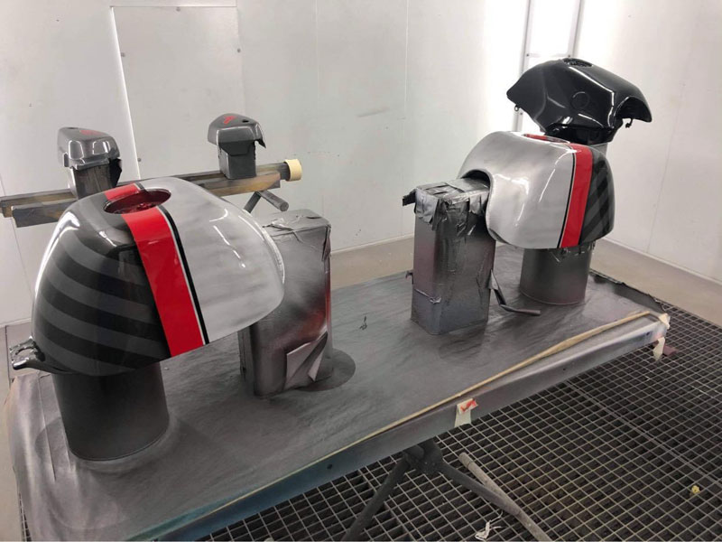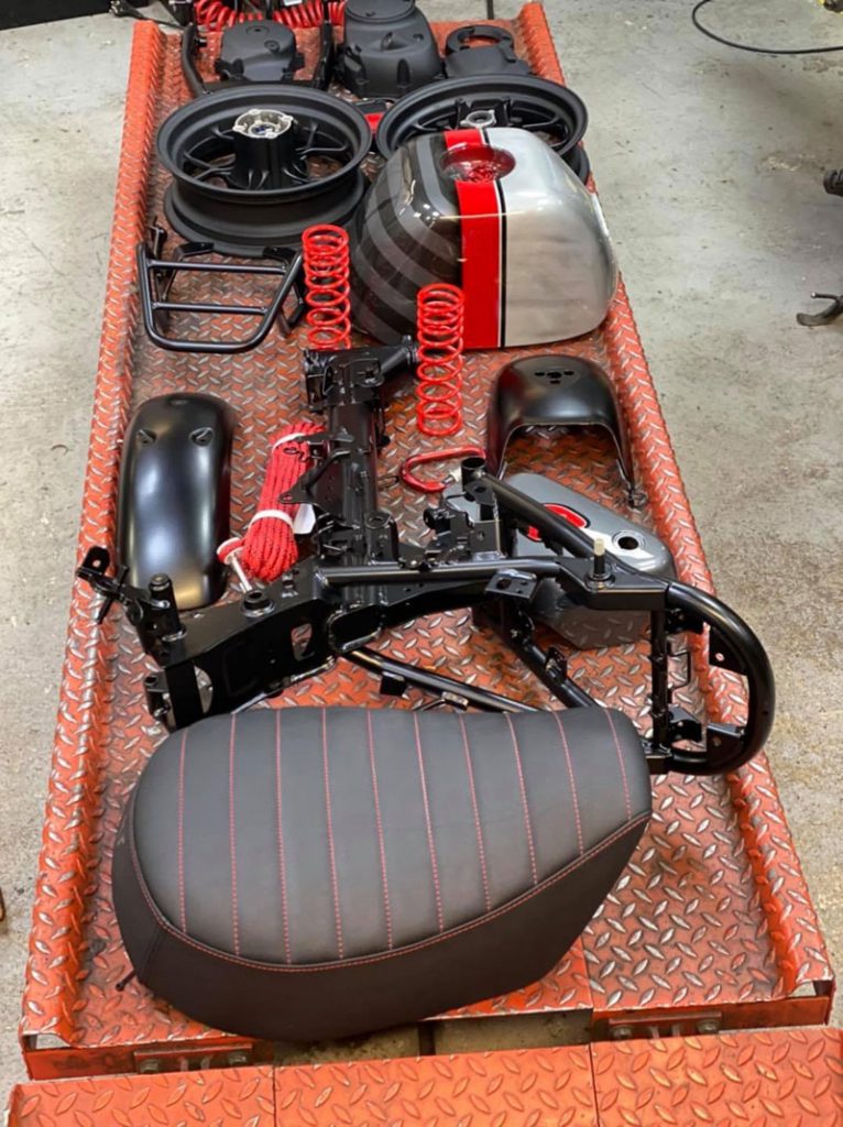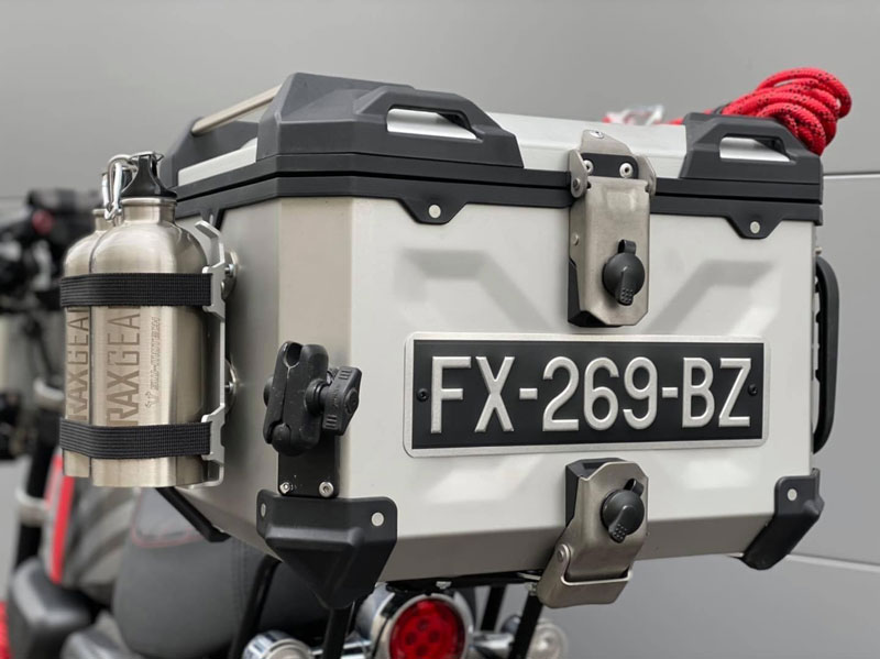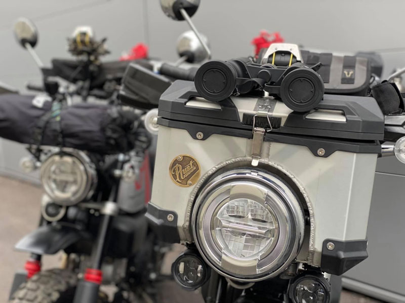 สังเกตดีๆ หนึ่งในสองคันนี้มีการวางไอเดีย แบกปี๊บหน้า-หลัง ยังมีการออกแบบติดกล่องสไตล์ท็อปบ๊อกซ์ตรงด้านหน้ารถด้วย อย่างแรกคือเสริมแร็คยึดโยงมาจากแกนเฟรมใต้แผงคอ จากนั้นคัสตอมตีกล่องอลูมิเนียมขึ้นใหม่ให้มี “ส่วนเว้า” สำหรับการ “ย้ายไฟหน้า” ออกมาติดตั้งอยู่ด้านหน้ากล่อง อันนี้เจ๋ง!!