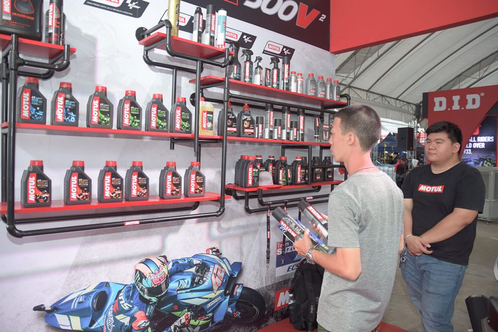 ด้านนอกสุดที่รอต้อนรับผู้มาร่วมชมงานเป็นเจ้าแรก คือ ผู้ผลิตโซ่-สเตอร์แบรนด์ไทย JOMTHAI ซึ่งมาพร้อมกับดีไซน์บูธที่สวยงาม และนำผลิตภัณฑ์ดัง สเตอร์ตราพระอาทิตย์มาจัดแสดง แถมเกมแจกรางวัลมาให้แฟนๆได้ร่วมสนุกมากมาย… ถัดมาเป็นน้ำมันเครื่อง Motul ที่ขนผลิตภัณฑ์มาครบครัน… เช่นเดียวกับแบรนด์โซ่ระดับโลกอย่าง D.I.D ซึ่งงานนี้นอกจากโชว์โซ่รุ่นฮิตหลายรุ่นแล้วยังมีสติ๊กเกอร์สวยๆมาแจกตลอดงาน