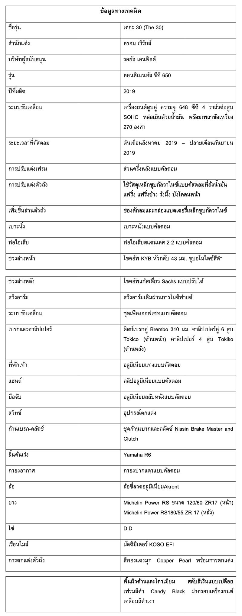 ครอม เวิร์กส์ จาการ์ตา ปั้นแต่งคอนติเนนทัล จีที 650 ให้กลายเป็นการจุติของรถคัสตอมคันใหม่ที่มีชื่อว่า “เดอะ 30” รถจักรยานยนต์ที่ส่งพลังสะท้อนแนวคิด Back to The Roots ของการจัดงานคัสตอมเฟสต์ในปีนี้ได้อย่างสมบูรณ์แบบ โดยตัวเลข 30 มาจากอายุของบริษัทผู้สร้าง