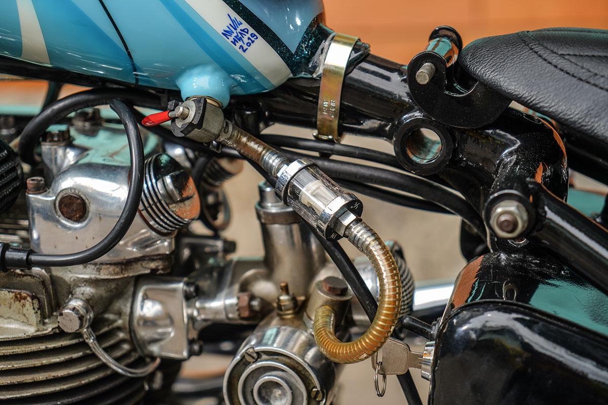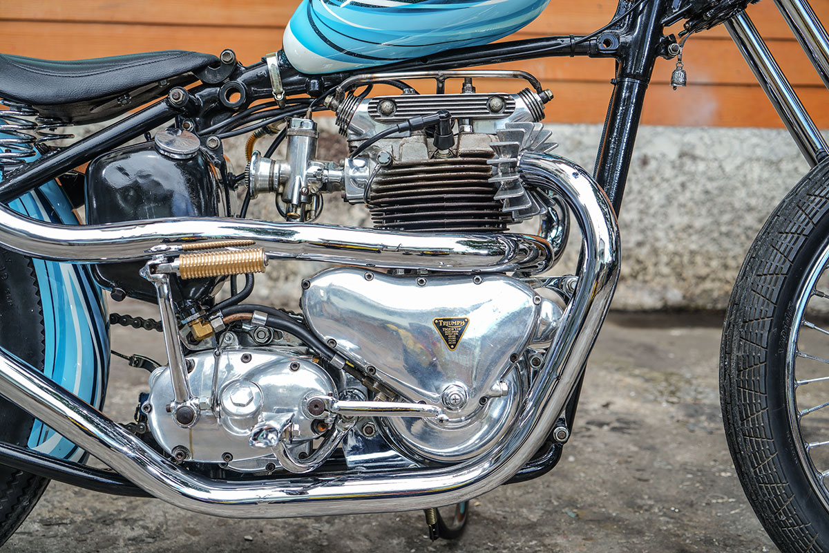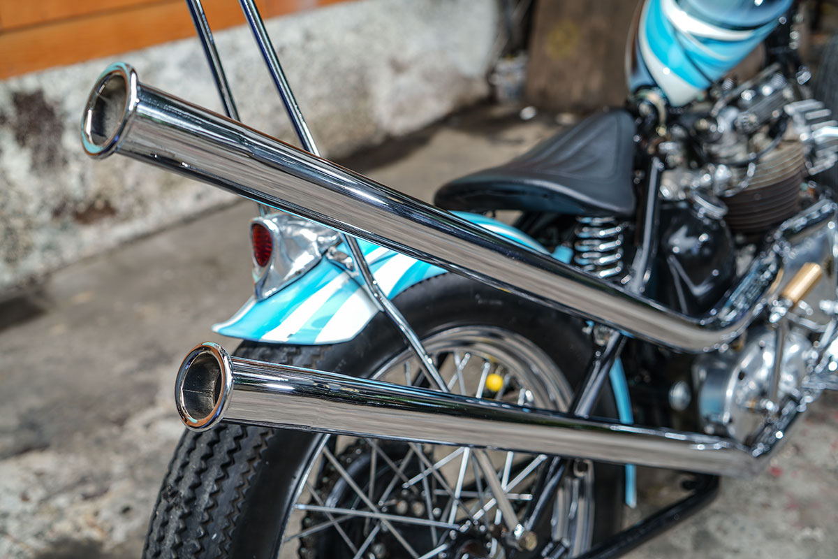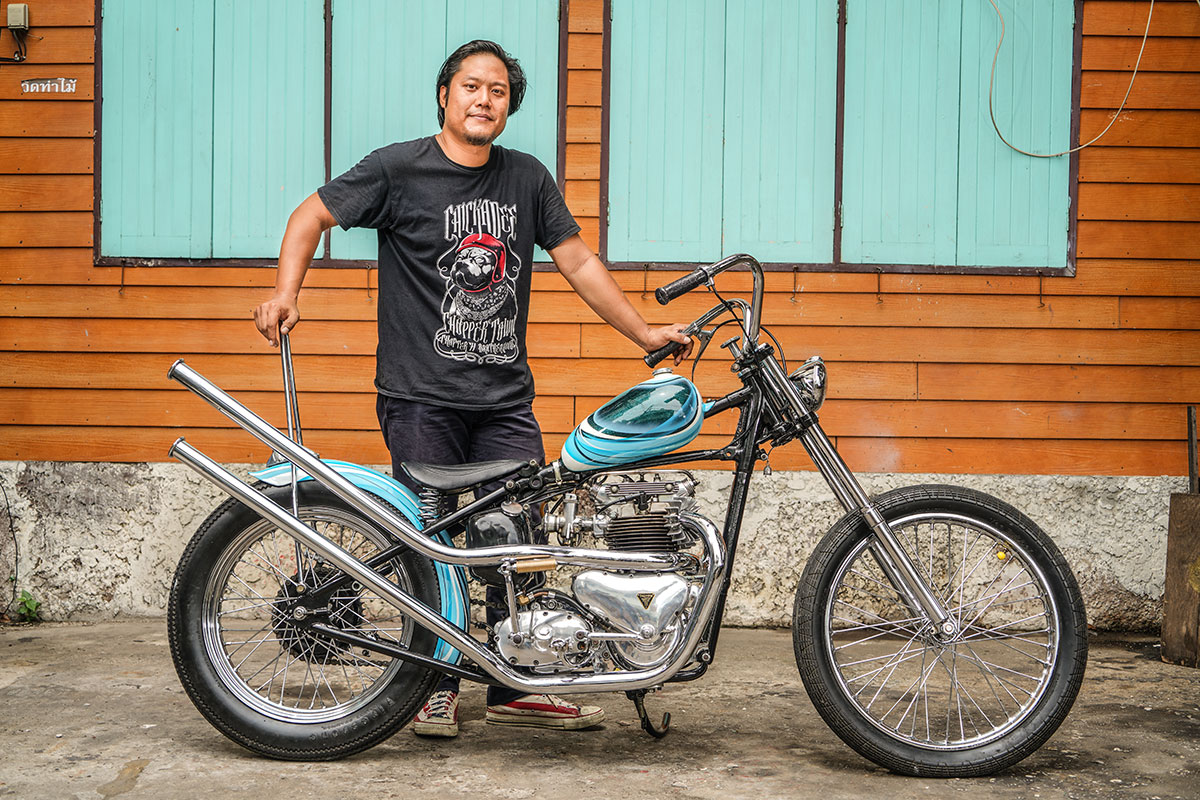 รถคันนี้ได้รับแรงบันดาลใจมาจาก Triumph ของ Mark Drews ในงาน Yokohama Hot Rod 2013 เริ่มต้นด้วยเฟรมจากปี 1947 แปลงท้าย Hardtail จับคู่ล้อหน้าดุมล้างเนียนๆ ขนาด 21 นิ้ว รัดด้วยยางลายตรงจาก Vee Rubber ไซส์ 3.25 และล้อหลัง 19 นิ้วมากับยางฟันเลื่อย Firestone ไซส์ 4.00 ช่วงหน้าเดิมติดรถ เป็นโช้คแบบ Telescopic ไฟหน้ากลมเลนส์ขาวของยูนิตี้ รีโปร แฮนด์ทรงกระเช้า ปลอกแฮนด์กากเพชรจาก V-Twin ถังน้ำมัน ”ทรงหยดน้ำ” ลวดลาย “สีฟ้าขาว” จาก ANVIL HEAD ทำให้รถคันนี้ดูสง่างามมากยิ่งขึ้น ระบบเบรค มีเพียง “ดรัมเบรคหลัง” เท่านั้น!