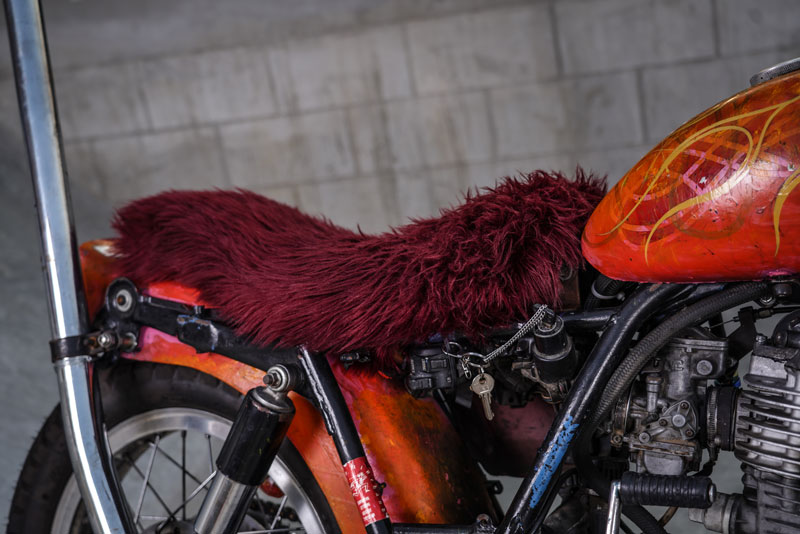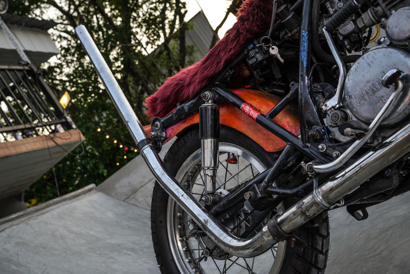 ถัดมาเบาะนั่งทรง Cobra Seat จากสำนัก “Ya Seat Custom” บวกออพชั่นด้วย พรมหุ้มเบาะสีเลือดหมูสุดนุ่มนวลสามารถถอดออกได้ง่าย บังโคลนท้ายแบบ Duck Tail โช้คหลังแบรนด์ดังอย่าง “Daytona” ขนาด 11.5 นิ้ว ประกับไฟและรูสวิทช์กุญแจถูกย้ายมาอยู่ด้านข้างของตัวเฟรม เพื่อทำให้ช่วงด้านหน้าของรถ ดูโล่งสบายตา! ต่อกันที่อีกหนึ่งจุดไฮไลท์อย่าง ท่อที่พาดยาวลอดใต้ตัวเฟรม หักปลายท่อสูงท่วมหัวเพื่อความบ้าคลั่ง !