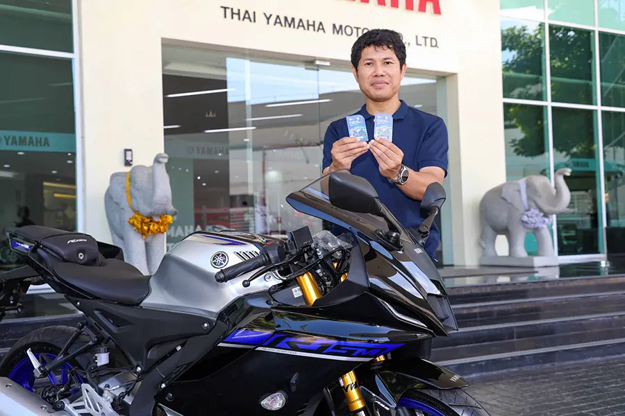 นายอุกฤษณ์ ภาควิวรรธ รองผู้จัดการใหญ่ด้านวางแผนการค้า และการตลาด บริษัท ไทยยามาฮ่ามอเตอร์ จำกัด ถ่ายภาพ และมอบรถจักรยานยนต์ YAMAHA R15M Connected-ABS ให้กับนายเดชฤทธิ์ เฉวียงวงค์ ผู้โชคดีจากการซื้อบัตรชมการแข่งขันรถจักรยานยนต์ทางเรียบชิงแชมป์โลก MotoGP รายการ พีที กรังด์ปรีซ์ ออฟ ไทยแลนด์ ระหว่างวันที่ 25 – 27 ตุลาคม 2567 ที่ผ่านมา โดยมี ฟาบิโอ กวาร์ตาราโร นักแข่งแชมป์โลก 1 สมัย เป็นผู้จับรางวัลมอบโชคในครั้งนี้ ซึ่งผู้โชคดีในครั้งนี้เป็นลูกค้ารถจักรยานยนต์ยามาฮ่า โดยใช้สิทธิ์ส่วนลดค่าบัตร 20% จากการโชว์กุญแจรถยามาฮ่า YZF-R1 ที่เคาน์เตอร์เซอร์วิสใน 7-11 และร่วมชมการแข่งขันรถจักรยานยนต์ทางเรียบชิงแชมป์โลก ก่อนคว้าดวงรับกุญแจรถ YAMAHA R15M Connected-ABS มูลค่า 138,000 บาท ไปครอง